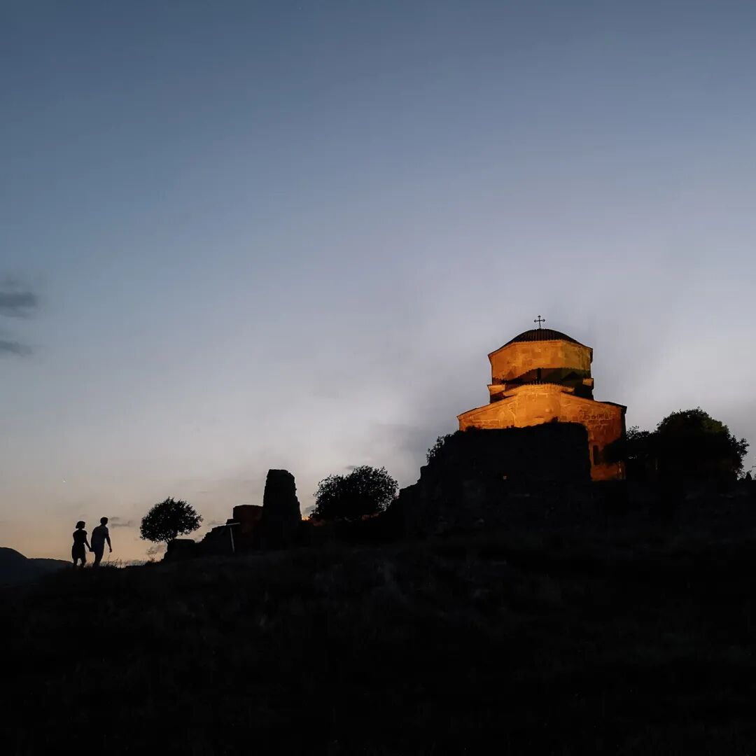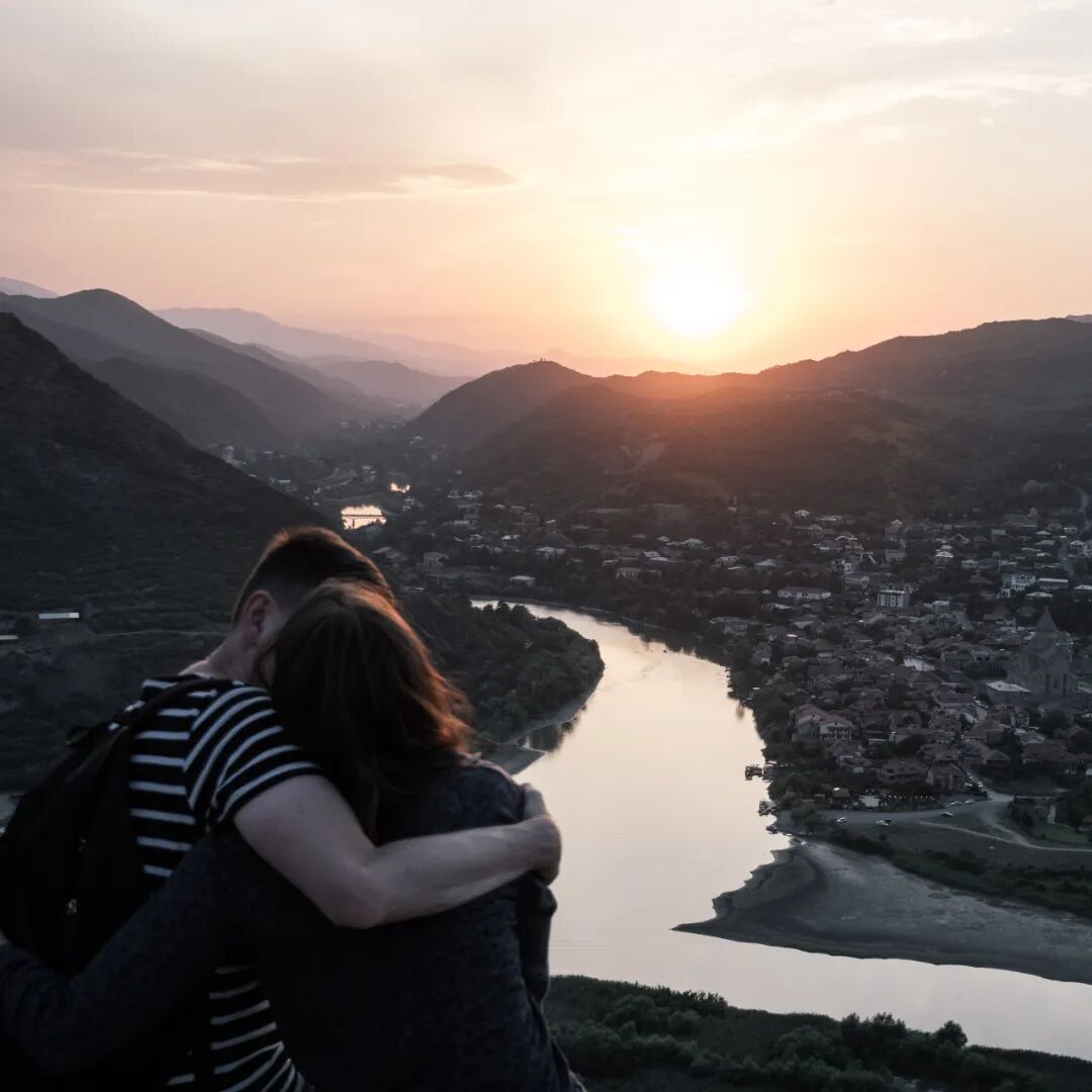 在十字架修道院看夕阳西下,河滩边上就是姆茨赫塔小镇