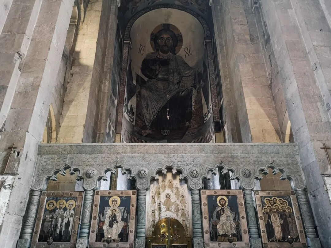 根据传说和上下文,这个教堂名字中的Svetitskhoveli一词其实理解为“有生命的柱子”或者“被赐予生命的柱子”会更确切,约定俗成叫做生命之柱大教堂也不算错。这个教堂里面有一座圣坛,据说下面埋着耶稣的长袍。当然,谁都不敢挖开看,万一摸一下就跟西多尼亚一样“激动死”怎么办?甚至万一跟印第安纳琼斯(Indiana Jones)系列电影中的约柜一样直接把开启者融化了怎么办?所以就默认它里面有好了。