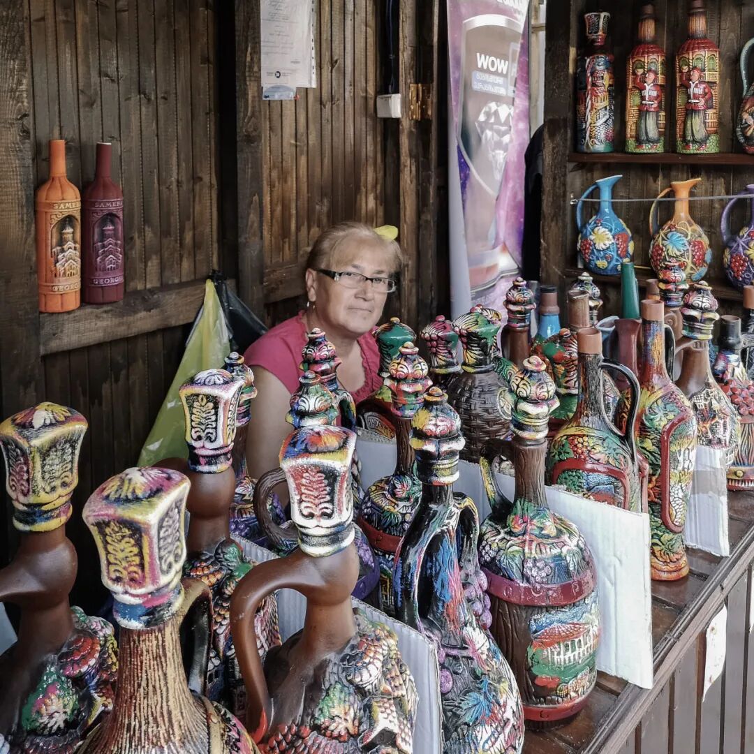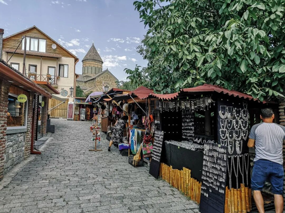 当年伊比利亚王国的首都姆茨赫塔(Mtskheta),就在第比利斯以北20公里的地方,姆茨赫塔如今看起来就跟个村儿似的,已经很难想象当年的规模。姆茨赫塔和西格纳吉一样,也是个以旅游观光为主的休闲小镇,基本是游客必到之地,感觉有点像上海的朱家角,大多数人都是过来玩半天。姆茨赫塔坐落在两河交汇之处,周围群山环绕,可惜没什么好的亲水平台,规划和开发得都不咋地。那个商业街上有卖纪念品和小吃,最具特色的是花花绿绿的格鲁吉亚陶罐葡萄酒,价格也不贵,大都不超过一百人民币,不嫌麻烦的话可以背一两瓶回来送人。
