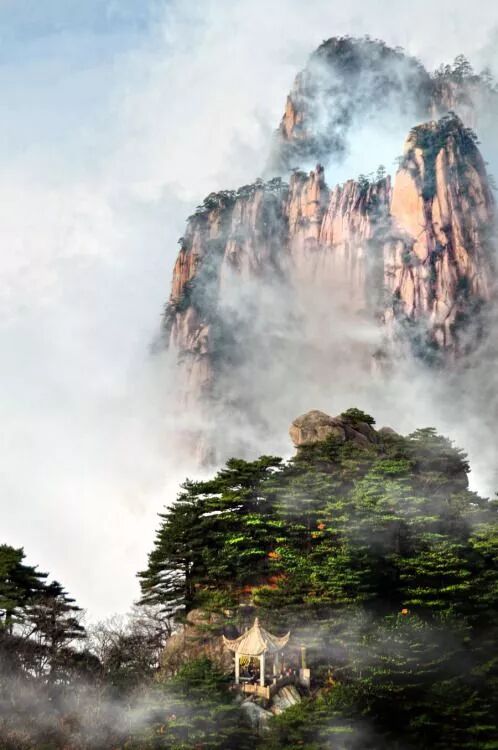 忽聚忽散的云雾把黄山烘托得更加富有仙韵,恍如置身于仙境之中。