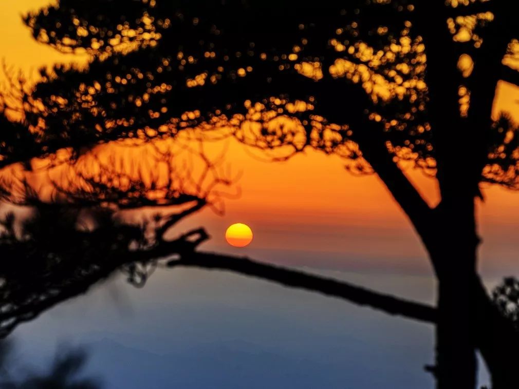 黄山落日余晖霞光映照,不自觉赞叹大自然的美丽。