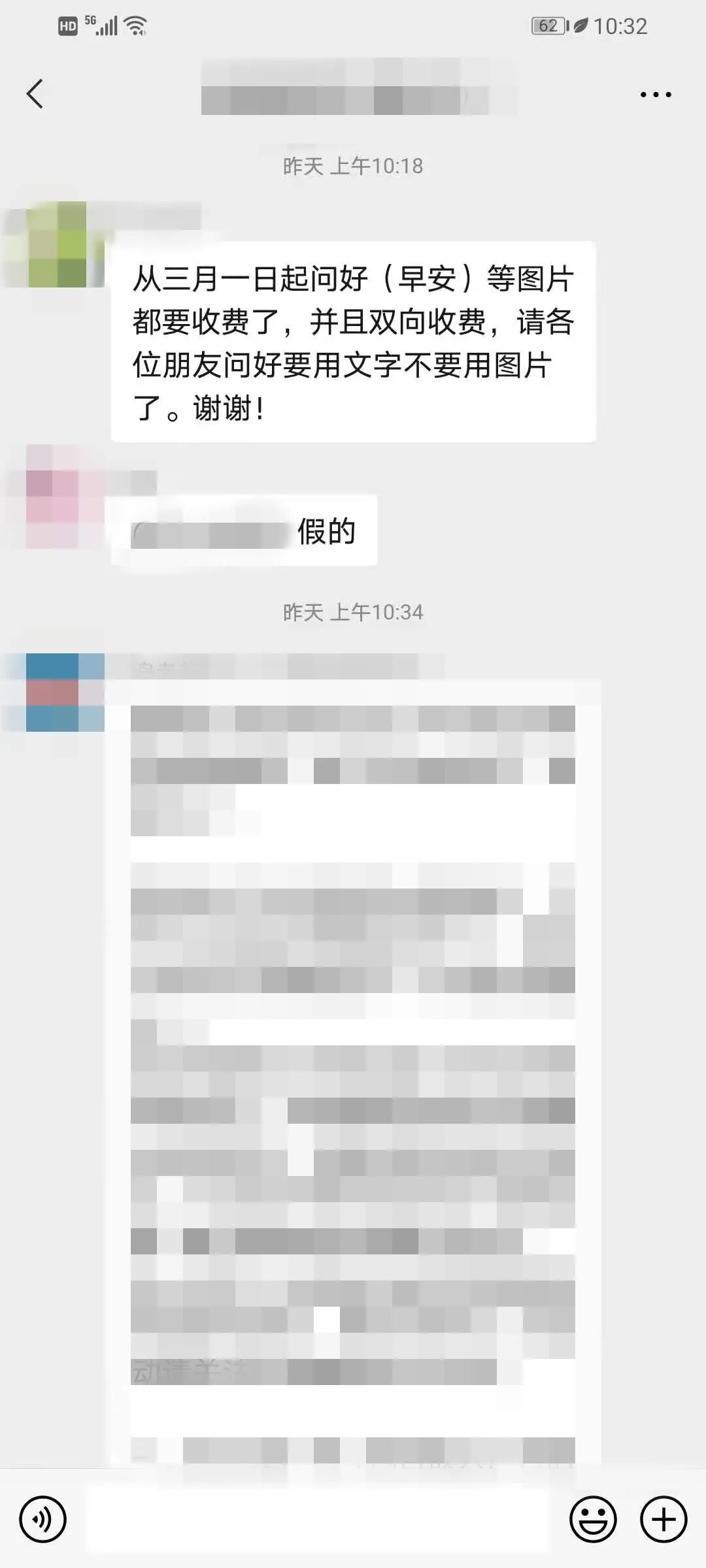 “从三月一日起问好(早安)等图片都要收费了,并且双向收费,请各位朋友问好要用文字不要用图片了。谢谢!”