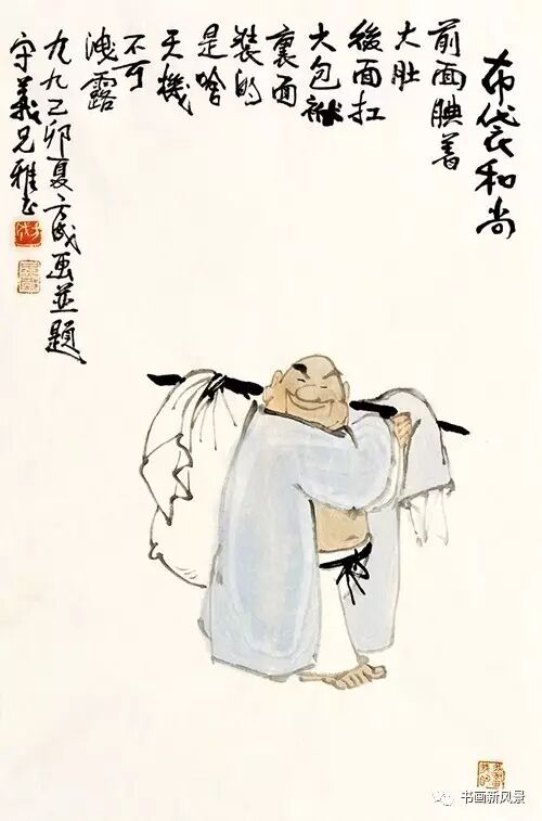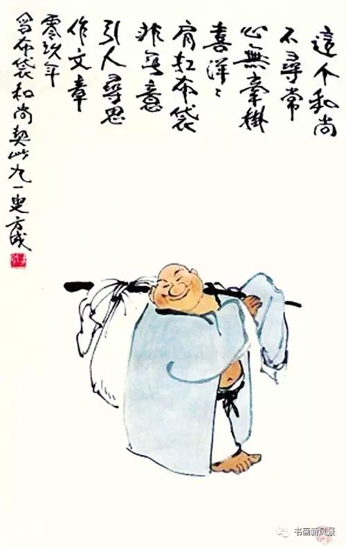 这个和尚不寻常,心无牵挂喜洋洋,肩扛布袋非无意,引人寻思作文章。
