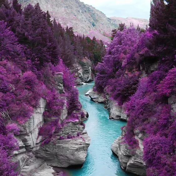满山紫色的树,蓝色的水,太美了