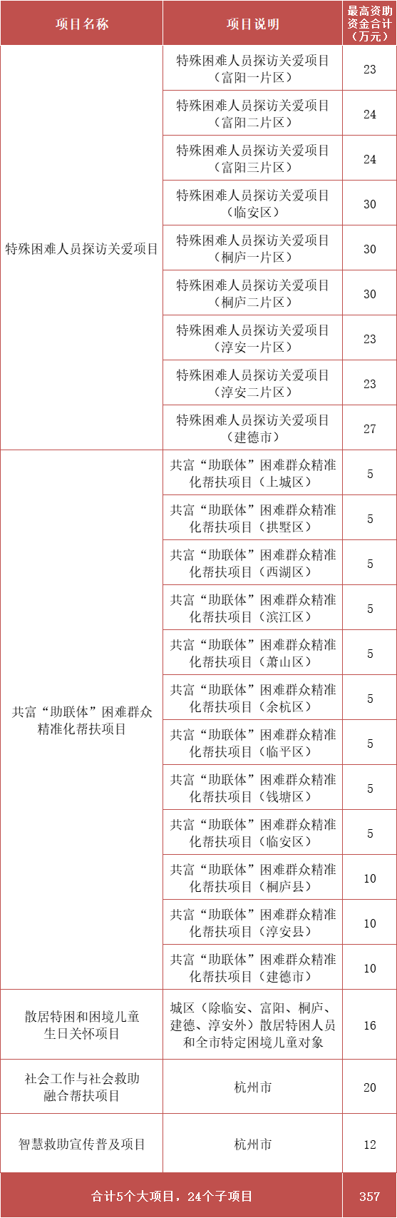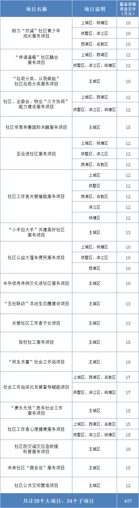 本次可申报的项目分为社区服务类、为老服务类、社会救助类,共计项目大项36个、子项85个,最高资助1248万元。其中社区服务类项目大项20个、子项34个,为老服务类项目大项11个、子项27个,社会救助类项目大项5个、子项24个(项目详情可查看《2022年杭州市市级公益创投项目发布汇总表》,下载方式附文末)。