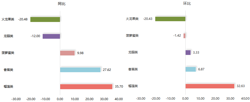 环比来看,火龙果类环比价格指数下跌20.43%;菠萝蜜类环比价格指数小幅下跌1.42%。而龙眼类、香蕉类环比价格指数分别上涨3.33%和6.87%。