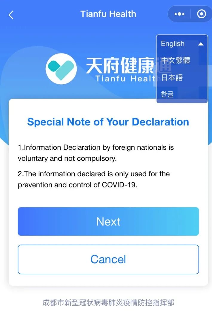 When you enter the application page, you will see a special note of your declaration, which states that the information provided by foreign nationals is voluntary and not mandatory; and the information provided is only used for the prevention and control of the COVID-19. Users can select the language in the upper right corner, and proceed to the next step by clicking Next.