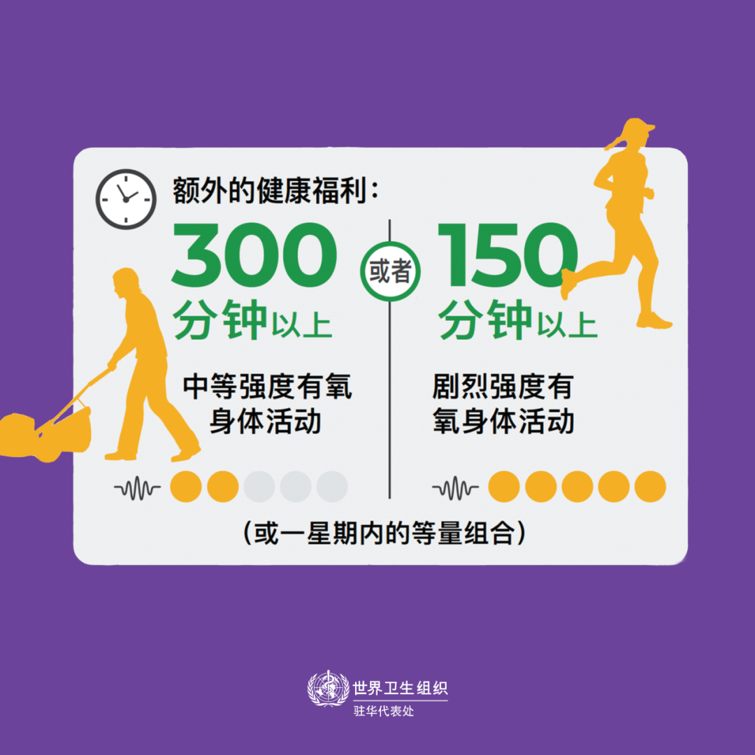 世卫组织最新身体活动指南建议所有成年人,包括慢性病患者或残障人士,每周至少进行150至300分钟的中等到剧烈的有氧活动。