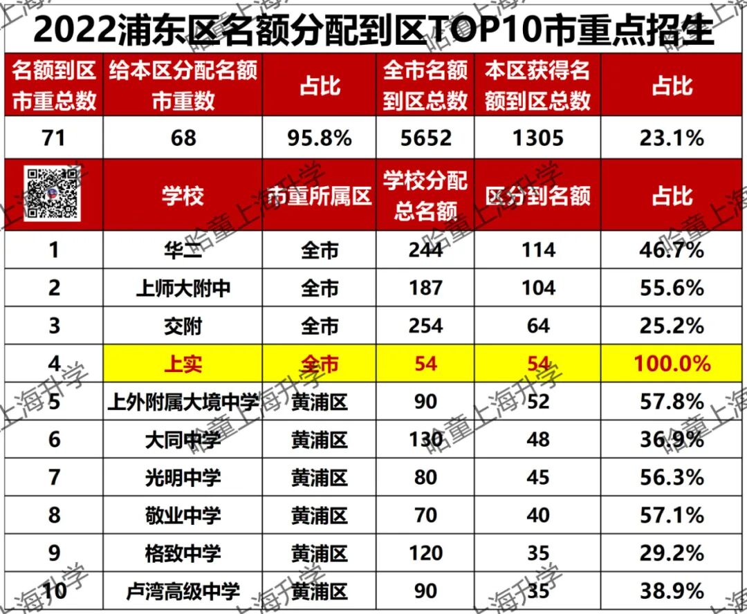浦东名额分配到区的市重点中,最特殊的要数上实了,上实名额分配到区招生计划是54,全部计划都分给了浦东,上实这赤裸裸的偏爱啊!