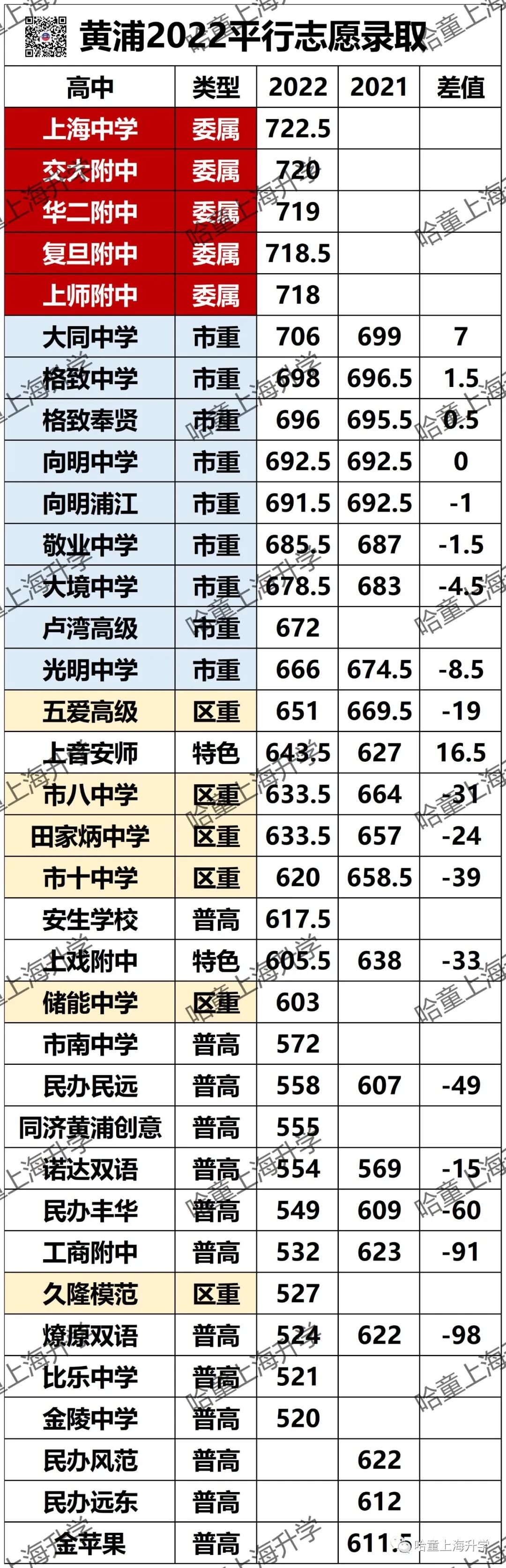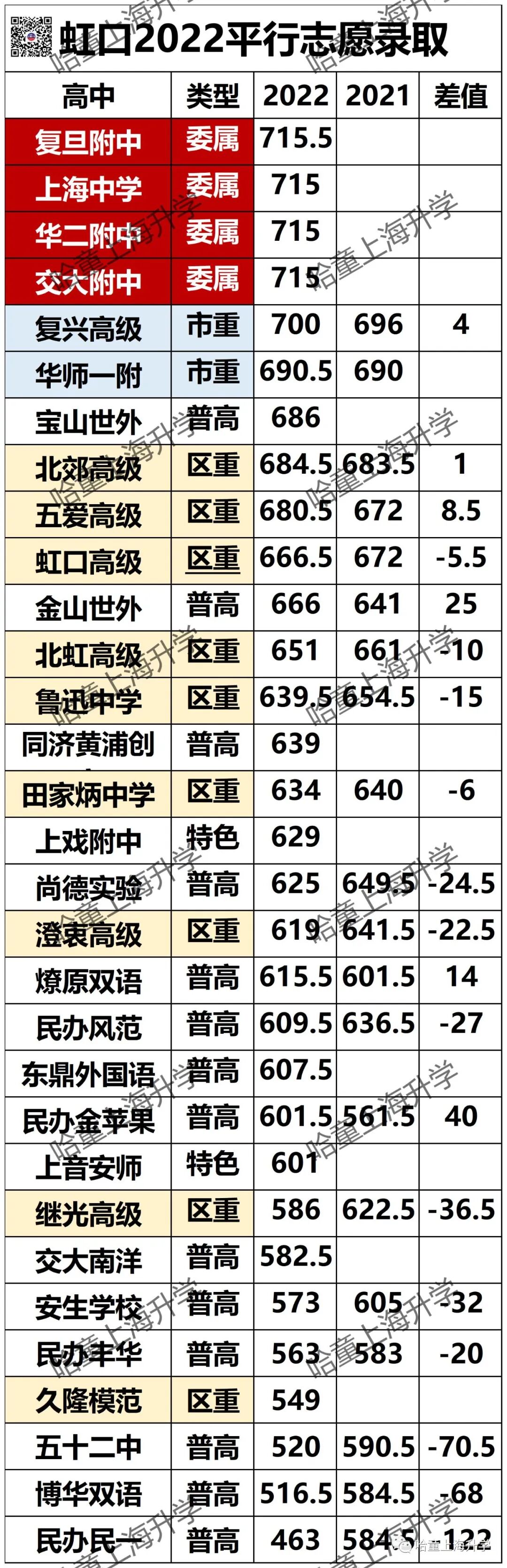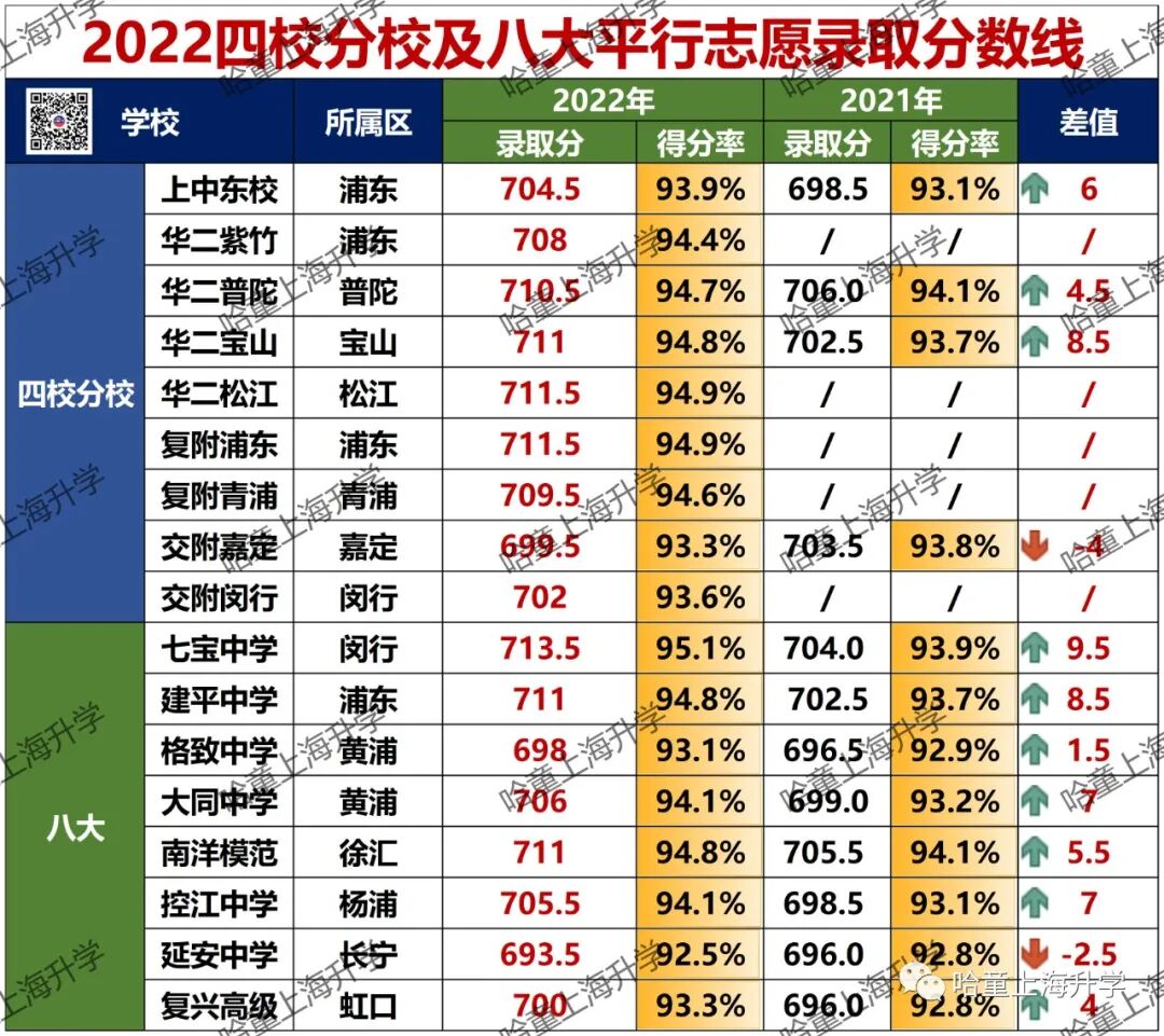 2022年,四校在全市共计招收72个平行志愿,其中上中23个,华二16个,复附16个,交附17个。16区区中,四校录取的最低分为: