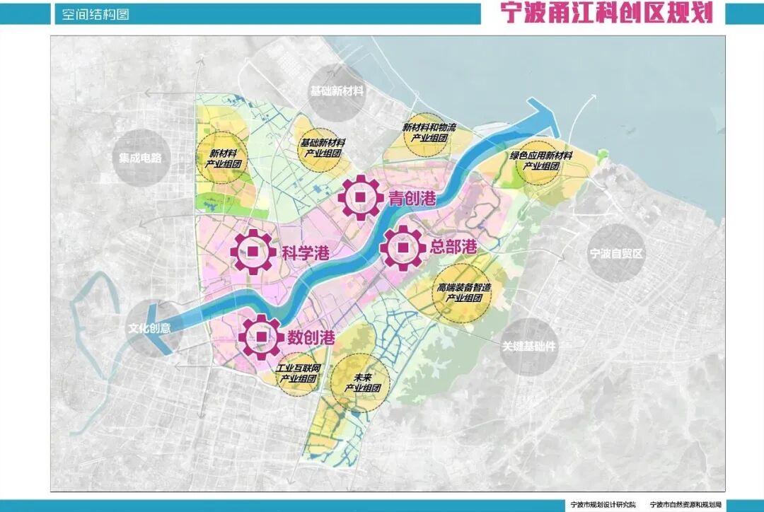 2.重构空间格局。甬江科创区重构了“一区四港多组团”两岸功能高度协同的的空间格局,实现空间更高效、产业更集聚、生态更优越、设施更完善。其中“一区”为甬江科创区,作为宁波创新发展的核心引擎;“四港”是甬江科创区的核心功能板块,既有各自主导功能,又相互联系,是实现甬江两岸从运输港到科技港飞跃的重要载体,包括围绕原始创新和基础研究的“科学港”,围绕数字创新和研发转化的“数创港”,围绕国际交流和青年创新的“青创港”,以及围绕总部服务和高端配套的“总部港”。