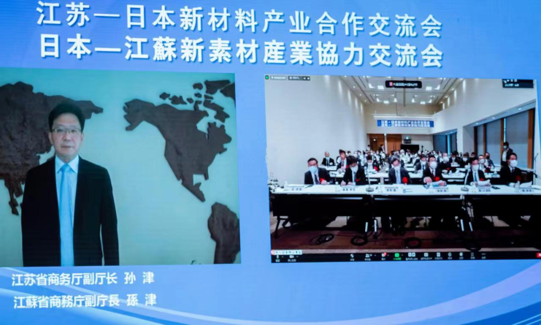 江苏省商务厅孙津副厅长通过视频为交流会致辞。他首先向在南通和东京参加本次交流会的嘉宾们问好,并充分肯定了日企在江苏发展过程中所起到的重要推动作用,同时寄望已经成功吸引东丽、旭化成、信越等世界知名企业入驻的南通,再接再厉,在新材料领域取得更深入发展。他还表示,“配合江苏‘十四五’规划提出,要构建循环发展、绿色低碳的现代产业体系,积极发展新一代信息技术、新材料、节能环保等产业”,用“市场化、国际化、法制化的一流营商环境”,“最具竞争力的投资目的地”,并诚挚欢迎日本经企界人士继续来苏考察投资兴业,共谋合作发展。