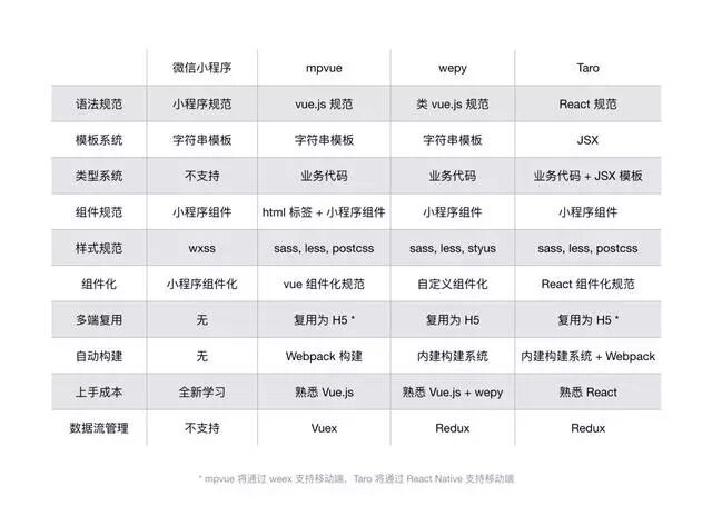 前端指小程序界面开发,简单的项目直接用官网提供的组件和api就可以开发。基本上是 JavaScript+css+View,如果有web开发的基础,上手真的是分分钟钟。当然有一些大牛为了提高小程序开发的体验或效率,开发了一些框架,在框架的基础上开发小程序,会更简单高效。目前比较常用的有以下几种,菜鸟君不再详细介绍,有需要的可自行查询。刚开始学习,菜鸟君还是建议从小程序官方组件入手!