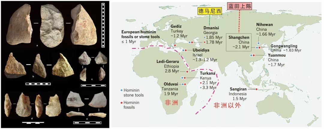 由中国科学院广州地球化学研究所朱照宇、古脊椎动物与古人类研究所黄慰文和英国埃克塞特大学Robin Dennell领导的团队历经13年研究,在陕西省蓝田县发现了一处新的旧石器地点——上陈遗址。研究人员综合运用黄土-古土壤地层学、沉积学、矿物学、地球化学、古生物学、岩石磁学和高分辨率古地磁测年等多学科交叉技术方法测试了数千组样品,建立了新的黄土-古土壤年代地层序列,并在早更新世17层黄土或古土壤层中发现了原地埋藏的96件旧石器,包括石核、石片、刮削器、钻孔器、尖状器、石锤等,其年龄约126万年至212万年。连同该团队前期将蓝田公王岭直立人年代由原定距今115万年重新定年为163万年的结果,上陈遗址212万年前最古老石器的发现将蓝田古人类活动年代推前了约100万年,这一年龄比德马尼西遗址年龄还老27万年,使上陈成为非洲以外最老的古人类遗迹地点之一。