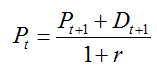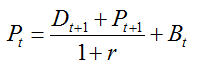 其中Pt是当期价格,Pt+1是t+1期价格,Dt+1是t+1期股息。由于人类存在的对当期的偏好,所以会有一个贴现因子r来补偿。在理想的情况下,任何一个股票都应该满足这个公式,只是因为价和股息不同才会产生股票价格不同。在有限期的模型当中,任何超过T期的股票价格PT+1和股息DT+1都应当是0,所以股票价格就变成了