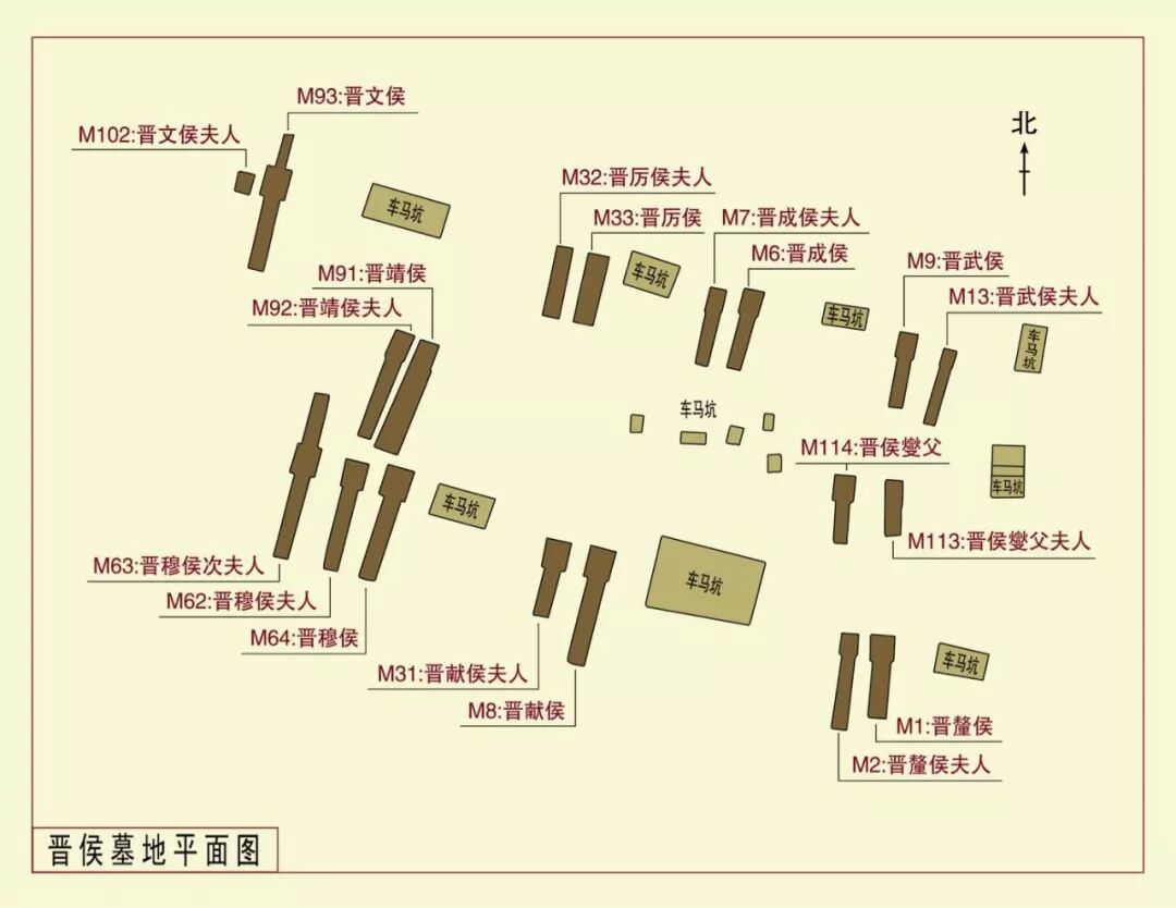 叔虞封唐后,燮父以下,以晋为号,以翼为都,西周时期的晋晋侯有九代。天马—曲村墓地正好包含九组晋侯大墓。第一组(M114、M113)是燮父及其夫人墓,第二组(M9、M13)是武侯及其夫人墓,第三组(M6、M7)是成侯及其夫人墓,第四组(M33、M32)是厉侯及其夫人墓,第五组(M91、M92)是靖侯及其夫人墓,第六组(M1、M2)是釐侯及其夫人墓,第七组(M8、M31)是献侯及其夫人墓,第八组(M64、M62、M63)是穆侯及其夫人、次夫人墓,第九组(M93、M102)是文侯及其夫人墓(《晋世家》的九代晋侯:晋侯燮父、武侯宁族[或本作曼期、曼旗]、成侯服人,未见铭文;厉侯福,相当铭文晋侯僰马;靖侯宜臼,相当铭文晋侯喜父;侯司徒,相当铭文晋侯对;献侯籍,相当铭文晋侯苏和晋侯[籍是苏之讹]。穆侯费王[或本作弗生、