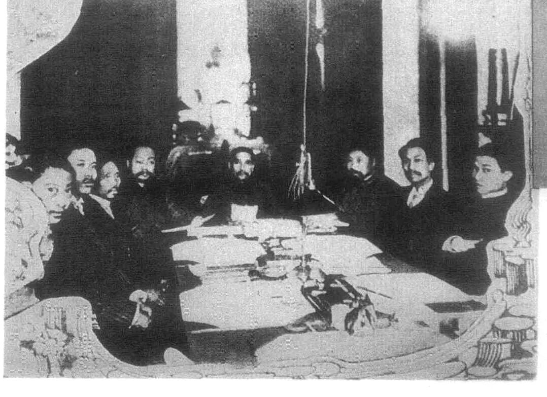 1912年1月5日,中华民国南京临时政府第一次国务会议,右起:王鸿猷、王宠惠、黄兴;左起:黄钟瑛、景耀月、蔡元培、陈锦涛;中间:孙中山(图片来源:wikimedia.org)