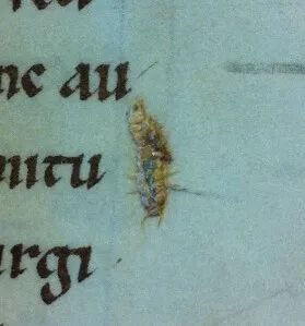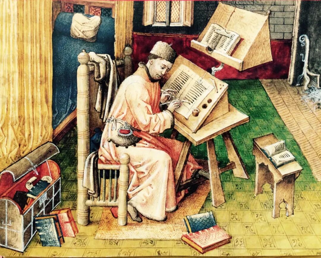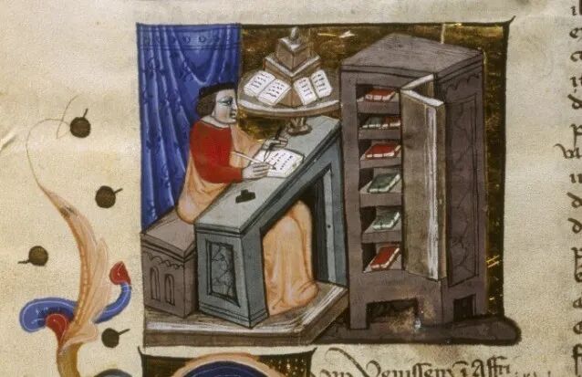 假如你在今天弄丢了大学图书馆的一册藏书,可能需要支付三到十倍书价的罚款,如果弄丢的是珍本,或是有意无意地一犯再犯,你可能会被管理员拉进黑名单,暂时或永久性丧失借书资格。仅此而已。但若你生活在古登堡建立印刷所之前的中世纪欧洲,你会发现后果要严峻得多。泥金彩绘手抄本是中世纪文化传承的主要物质载体,而制作手抄本又极其费财费力,以成书于八九世纪的爱尔兰国宝《凯尔经》为例,其书写材质(三百四十页对开牛皮纸)取自约一百八十五头小牛犊,由于缮写前须反复用青柠汁或粪水将牛皮泡软并以月刀去除毛根,若是制作时间紧张,这一数字可能激增至一千二百头。众多当代艺术家严格使用中世纪材料(浮石、鹅毛笔、矿物颜料、金箔)进行制书实验,发现完成一页繁复程度远不及《凯尔经》的抄本约需五十小时,而手绘一页“圣名文织”这样精彩绝伦的彩页大概需要一个月。考虑到依赖日光因而严重受制于天气的中世纪书写环境,以及缮写士(誊抄工)与绘经师之间的合作,整本书的制作需时可窥一斑。勃艮第公爵的誊抄工让·米耶洛肖像(约1461年)手抄本不仅贵比真金,而且往往是某个修道院或其他社群阅读某部作品的唯一途径,是缮写士们几年甚至十几年伏案劳动的成果。丢失一本书不仅意味着物质财富的丧失,更意味着失去通往某种宗教或世俗知识的独一无二的钥匙。因而你或许可以理解,为什么少量对公众开放的中世纪图书馆每个座位旁都垂着铁锁链,并且诸多手抄本的扉页上写有“护书诅咒”(book curse)短语或短诗,以至于几乎形成了一个独立的文学传统。比如完成于十二世纪德国、今藏大英图书馆的《阿恩斯坦圣经》(Arnstein Bible,手稿编号 BL Harley MS 2798)的拉丁文护书诅咒是这样写的:“这本书属于阿恩斯坦的圣母玛利亚与尼古拉斯修道院:假如任何人偷走这本书,愿他死去,愿他在煎锅里烤焦,愿癫痫和热病击倒他,愿他在刑轮上转动,愿他被吊死。阿门。”(本文中护书诅咒和诗歌均由作者从拉丁文、中古英语等译为汉语)类似地,一本制作于十四世纪尼德兰的中古荷兰语百科全书《自然之花》(Der Nature Bloeme,手稿编号 BL Add MS 11390)在一个十字形状下抄有一段“护书死亡宣誓”,说明借书者已郑重起誓,一旦借书不还,他或她本人就会死去;只有一位自称为“助产妇”的女性借阅者勇敢地在下方签了字。“还书还是不还”变成了“生存还是毁灭”的问题。《阿恩斯坦圣经》护书诅咒页《自然之花》中的死亡宣誓页 但中世纪缮写士或图书管理员能对潜在的孔乙己们发出的最可怕的诅咒并不是“愿他死去”,而是开除教籍或者来世灵魂永困地狱的威胁。除了海量宣称窃书者将直接被开除教籍的护书诅咒,我们还能找到这个诗意盎然但效果类似的十三世纪版本:“这本书属于罗切斯特修道院:任何人若是偷走它,藏匿它,私藏它,或损毁或刮掉或删除这条铭文,愿他的名字从生命之书中被删除”(BL Royal MS 10 A XVI);或这个想象被窃的书自己向窃书贼复仇的版本:“凡是偷书或是借书不还的人,这本书会变成蛇啃噬你,并且你将患梅毒而痛苦地溶化着死去,你的内脏将被书虫吞噬,来世你将受到地狱之火的折磨”;或这个描绘了地狱之罚并将窃书者比作犹大的十五世纪版本:“这本书由约翰·维森斯泰德……赠予牛津的兄弟们,任何人若偷偷撕下或去除这条铭文,愿他(在地狱里)感受(魔鬼惩罚)犹大用的套索或大叉子!”(BL Royal MS 8 G X)禁止偷书人删掉“铭文”(即护书诅咒)这一信息的反复出现,暗示出这些现代人看来虚张声势的诅咒在中世纪具有实实在在的威慑力,有效到了时常有偷书贼想要删去它以逃脱诅咒的程度。