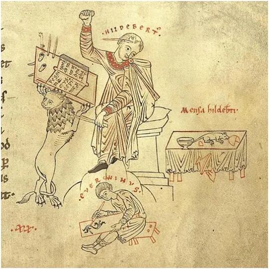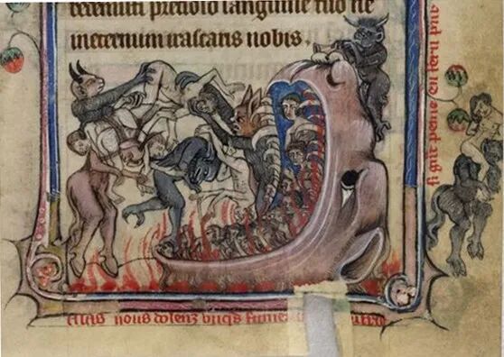 护书诅咒为窃书者描绘的地狱(12世纪手稿) 马克·德罗金(Mark Drogin)出版于一九八三年的专题史《天谴!中世纪誊抄工和护书诅咒的历史》(Anathema!Medieval Scribes and the History of Book Curses)中罗列了大量形形色色的护书诅咒,其中一些以短诗的形式出现,比如这首出现在林肯郡奥尔黛特教堂一本圣仪学抄本中的、简明有力的中古英语诅咒诗:“此书为一,基督之诅咒为二/带走一者,必带走二”;或这首出自收工的誊抄工的怒气冲冲的诅咒诗:“此书已完成,安放于君前/谦卑誊抄工,不欲做评判/若拿走此书,不管他是谁/愿他永不能,得见基督面/谁若胆包天,窃取本珍卷/愿他受诅咒,暴毙马路边/谁跃跃欲试,欲将此书窃/挖掉他双眼,挖掉他双眼!”另一些则带有显著地域特色:“偷窃本书的人会在巴黎被绞死,如果没被绞死,他会淹死,如果没淹死,他会烧死,如果没烧死,他会遭受比上述更可怕的结局”;或“我起誓:谁若偷走这本祈祷书,愿他被野猪撕裂,愿他心脏被捣碎,愿他的身体沿着莱茵河被拖拽”。有罪的灵魂被推入“地狱之口”,《泰茂斯时辰书》页底装饰假如你觉得这些血淋淋的护书诅咒不符合中世纪教会忍耐、宽恕、爱邻如己等普世伦理准则,想想誊抄工们恶劣的工作环境(采光差、文具劣、容错率低、工时长、工资低或干脆没有)和他们为缮写并装饰一册手抄本付出的艰辛努力,或许多少能理解他们为何选择了手中唯一的武器,即“词语”本身,来捍卫自己的劳动成果和自己所属社区的知识之源。一位腰酸背痛的誊抄工曾在页边信手涂下如下词句:“(誊抄工作)熄灭眼中之光,压弯背脊,挤碎内脏和肋骨,给肾脏带去剧痛,给整个身体带去疲惫。”有鉴于此,任何破坏书籍者,不仅仅是人类,都会遭到誊抄工的痛斥。比如以老鼠为代表的啮齿类动物,其危害不仅是叼走桌上的奶酪残渣那么简单,老鼠会啃坏珍贵的抄本,打翻墨水,污染书籍,吓到誊抄工并使之笔误——在羊皮或牛皮抄本上订正错误可不像今天用橡皮擦去铅笔字迹,或用修正液涂去钢笔字迹那么便捷,矿物颜料制成的墨水一旦从羽毛笔尖端渗入纤维深处,必须用小刀刮去表层的墨迹,方可再用新的字迹覆盖。所以针对老鼠的“护书诅咒”同样层出不穷,比如一部今藏布拉格神父会博物馆的十二世纪手稿中就画着誊抄工希尔德伯特(Hildebert)高举拳头赶老鼠的生动一幕,羊皮在他面前以(想象中的)福音圣兽狮子为支架的缮写台上摊开,上面用拉丁文写着:“可恶之至的耗子,你总是惹得我火冒三丈,愿上帝毁灭你!”