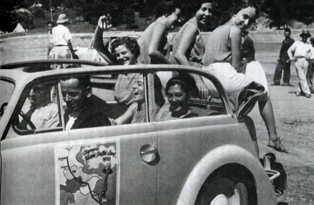 1936年柏林奥运会组委会汽车上扮成古希腊女神的女孩,去参加圣火交接仪式(《运动通史》)