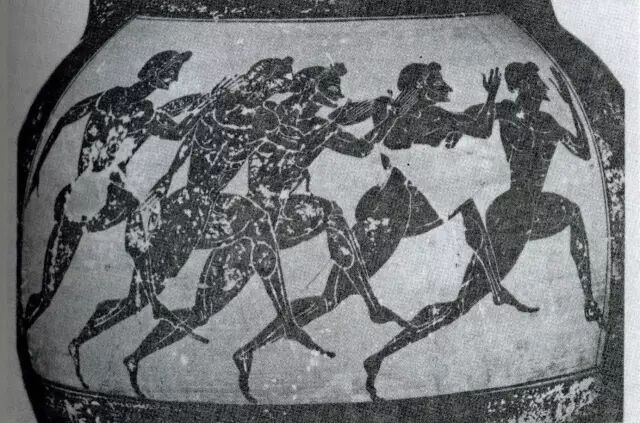 泛雅典娜竞技会上的赛跑者,古希腊双耳罐上的图饰,约公元前530年,藏慕尼黑州立文物博物馆(《运动通史》)