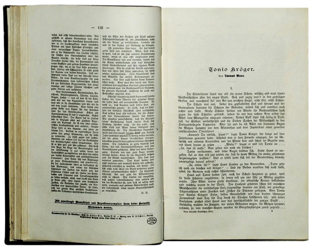 很多年后,人们仍然记得托马斯·曼出版《魔山》的一九二四年,获得诺贝尔文学奖的一九二九年,在流亡地说出“我在之地,即是德国“的一九三八年。但引领作家走向这些经历的,是他一九〇三年经历的一次转折。这一年,他决心结束一直以来游离于寻常世界之外的”异类“人生,寻找一条中间之道,从清醒却冷酷的“文人”变成对平凡事物怀有宽和爱意的“诗人”。这一转变反映在曼氏同年的中篇小说《托尼奥·克勒格尔》中,这篇小说是托马斯·曼从欧洲颓废文学代表走向为德国立言的大师这条漫长求索之路上的第一块基石。