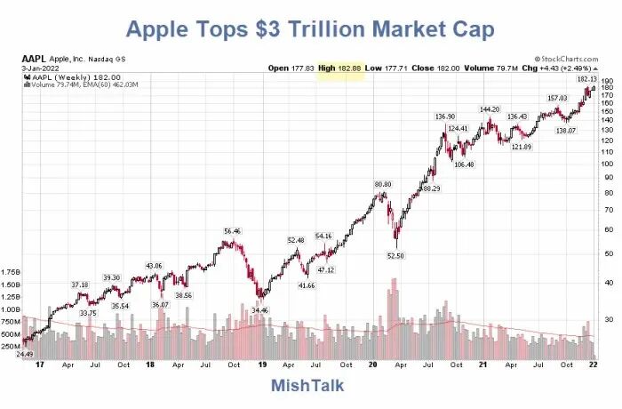 2022年1月3日,苹果公司市值登上3万亿美元大关,成为史上首家达到这一里程碑的公司(图片来源:mishtalk.com)