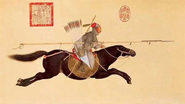[清]郎世宁绘《阿玉锡持矛荡寇图》中,阿玉锡除了弓箭之外,还携带了火器(图片来源:baidu.com)《北史》卷五四的斛律金父子传记,在斛律光兄弟射猎故事之前,还有一段不见于《北齐书》的记载,就与此有关:羡及光并工骑射。少时猎,父金命子孙会射而观之,泣曰:“明月、丰乐用弓不及我,诸孙又不及明月、丰乐,世衰矣。”