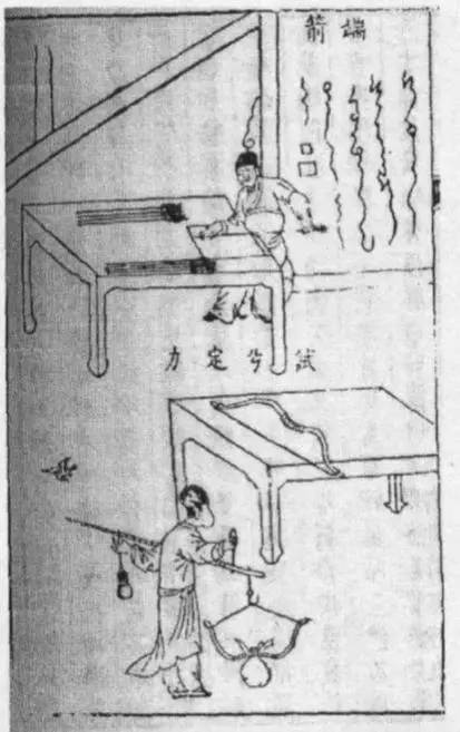 宋应星《天工开物》中,工匠用秤称量弓力大小(图片来源:zhihu.com)