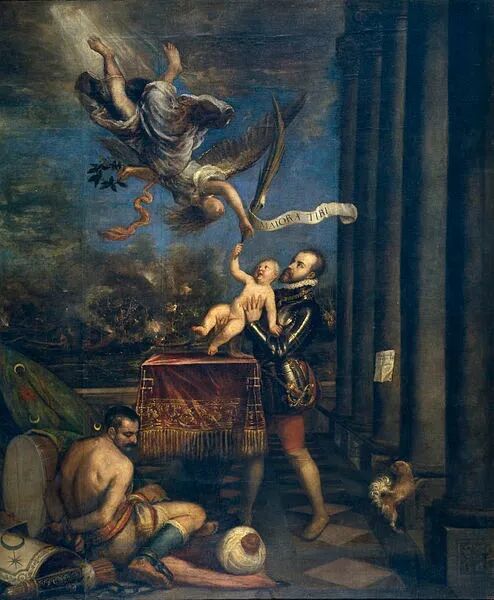 《勒班陀战役胜利后,菲利普二世将费尔南多王子献给天堂》,提香绘于1573-1575年间(来源:commons.wikimedia.org)