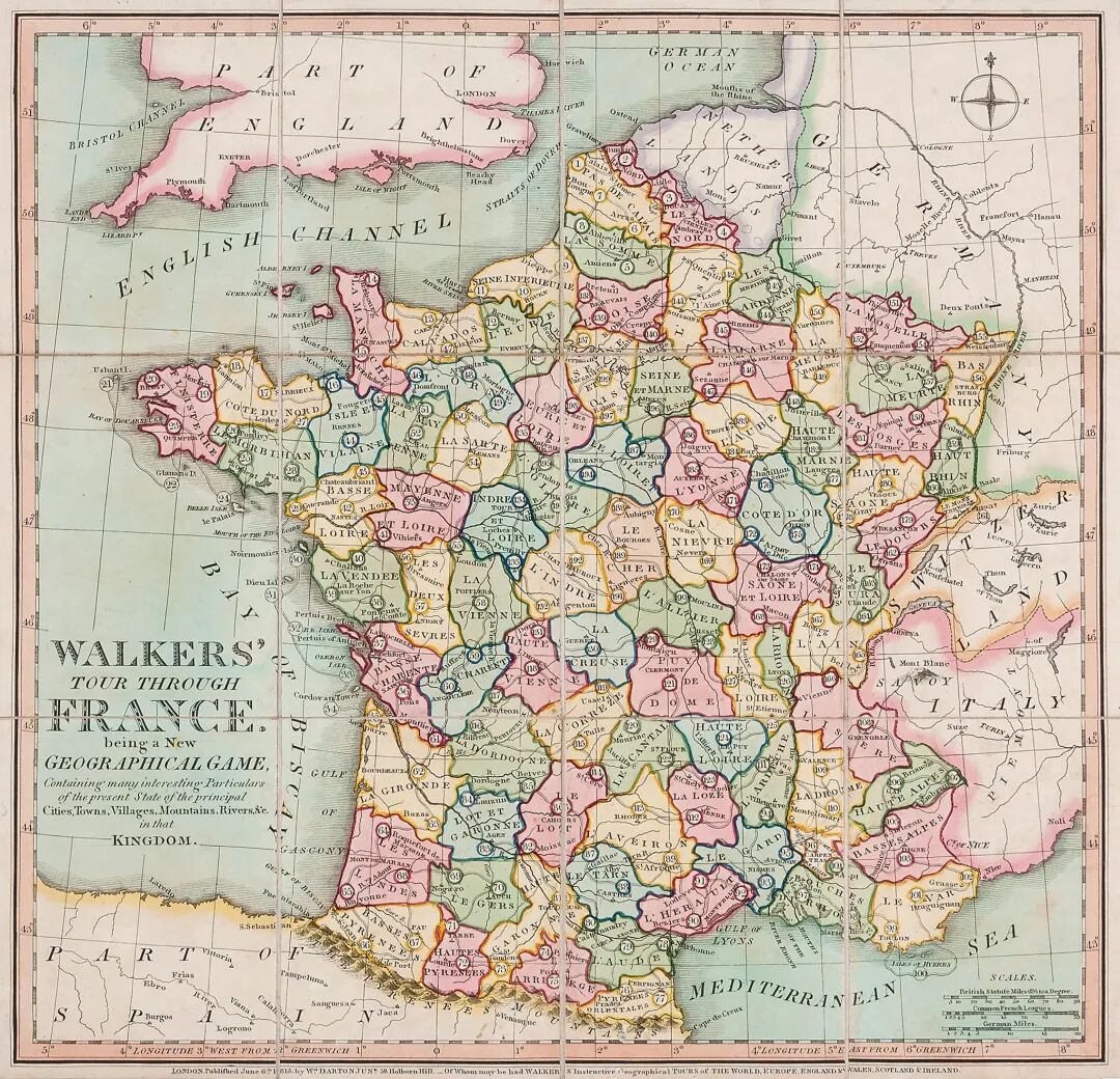 1815年,伦敦发行的环法之旅地理游戏,包含当时法国的主要城、镇、村庄、山脉、河流等许多有趣细节进入十八世纪以后,欧洲各国先后成立了皇家科学院、地理学会等知识机构,官方和民间的远洋行动与旅行记述也大量增加,尤其是一七五〇年后,科学考察成为一股风潮,相关的话题与成果也反映到鹅棋游戏的制作中。一七六八和一七八〇年,巴黎的克雷皮先后出版了两款以世界地图为主题的鹅棋,介绍了皇家科学院在全球的测绘成果,同时也标注了公众所热衷的实用旅行信息,包括“所有国家、人民、城市及其宗教、生产、商贸、教会、大学、海港的状况,还有欧洲在亚洲、非洲、美洲以及新发现的岛屿等地的种植园和交通路线等”。![]()