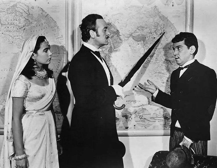 从时代语境来看,小说也反映了十九世纪势不可挡的大众化潮流。旅行不再是传统精英和贵族男子的专利,相反,平民、职工、中产阶层与年轻女性开始成为旅游业的主力。两部小说中的主人公们变换地选择铁路、蒸汽船、马车、汽车、自行车等不同出行工具,代表了一种快速增长的人类帝国力量,而竞速之旅中又潜藏着意外和风险。在这一点上,两部小说存在着内容与结构上的相似之处。不过,作为相隔二十多年的作品,它们所描写的旅行又有明显的差异。首先,在结构上,《八十天环游世界》从一开始就计划好了,有明确的站点与时间安排,尽管实际的过程存在着意外和困难,但最后主人公还是成功地到达终点。《一个怪人的遗嘱》中,游戏参与者天真地踏上旅程,但却遭遇到命运的戏弄,看似有明确规则,实际的人生轨迹与遭遇却完全随机。《八十天环游世界》更像是一款鹅棋,而《美利坚鹅棋游戏》才真正讲述了大环游的故事,贯穿全文的一个关键词是“命运”:旅行中的一切都是命运的选择,支撑它的是明确、清晰、理智的法则,但这些法则本身潜藏着意外、风险与破坏,这种张力关系体现在凡尔纳的诸多作品中,既表现出了一种竞速、进步与科学扩张主义的胜利意志,同时也隐含着神秘、焦虑与悲观的情绪。其次,在内容上,《八十天环游世界》中的福格更像是莫里斯·阿洛伊讽刺的典型英国游客:装作冒险式的探索,实际满足于指南上的路线,长途跋涉只是为了实现一种“打卡式”的目标。《一个怪人的遗嘱》更多还原了一种日常环游中的人物群像,作者利用巨额遗产来诱惑人们远离城市和原来的生活,到自然、古迹和未知的环境中去。1956年电影《环游世界八十天》剧照(来源:douban.com)