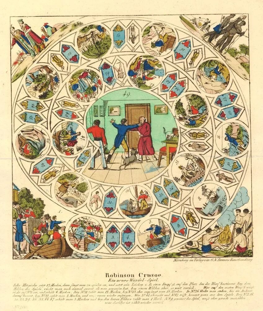 作为一种纯粹的赌运游戏,鹅棋的特殊之处在于它完全取决于偶然和运气,毫无策略可言。与此同时,格子所排列的单轨道与螺旋线路非常具有象征意义,既有一种机械神秘主义的色彩(像佛教的曼荼罗、北欧的衔尾蛇),又符合近代早期流浪者小说中“旅行传奇”(Le voyage Romanesque)的叙事结构,后者兴起于新航路开辟之后,相较于史诗和戏剧,这类作品在故事、人物、地点与环境描写上更趋于平面和零散,非常依赖于结构,尤其在对空间场景的使用上,所以像《忒勒玛科斯历险记》《鲁滨孙漂流记》这些十八世纪最受欢迎的旅行故事同《堂吉诃德》一样,都会被出版商制作成鹅棋游戏。到了十九世纪中期,旅行类小说开始以连载的形式发表,其地点、人物和章回式叙事很适宜于游戏改编。十九世纪四十年代,欧仁·苏的名著《巴黎秘事》《流浪的犹太人》等很快就成为畅销游戏。凡尔纳童年受到了这些旅行小说的影响。在一八九〇年的《青少年回忆录》中,他提到从前常读笛福的《鲁滨孙漂流记》,并且更加喜欢乔安·怀斯(Johann Wyss)一八一二年改写的启蒙读物《瑞士鲁滨孙》,这启发了他的《鲁滨孙叔叔》和《鲁滨孙学校》。与此同时,鹅棋在他的成长过程中也扮演了重要角色。在故乡南特,他常常和一位叔叔玩鹅棋,后者曾是一名船长,环游过世界。这不仅是《征服者罗比尔》的原型,还构成了《一个怪人的遗嘱》的直接灵感来源。![]()
