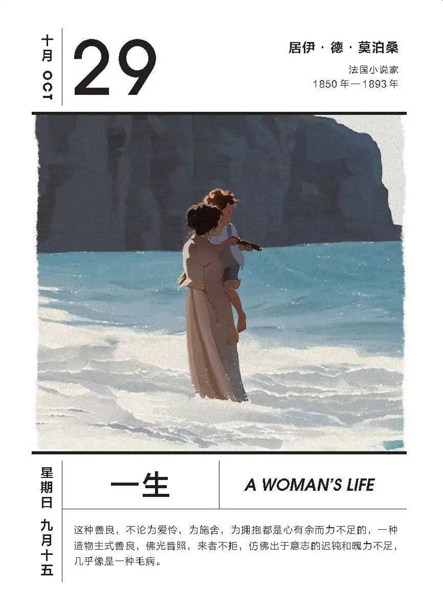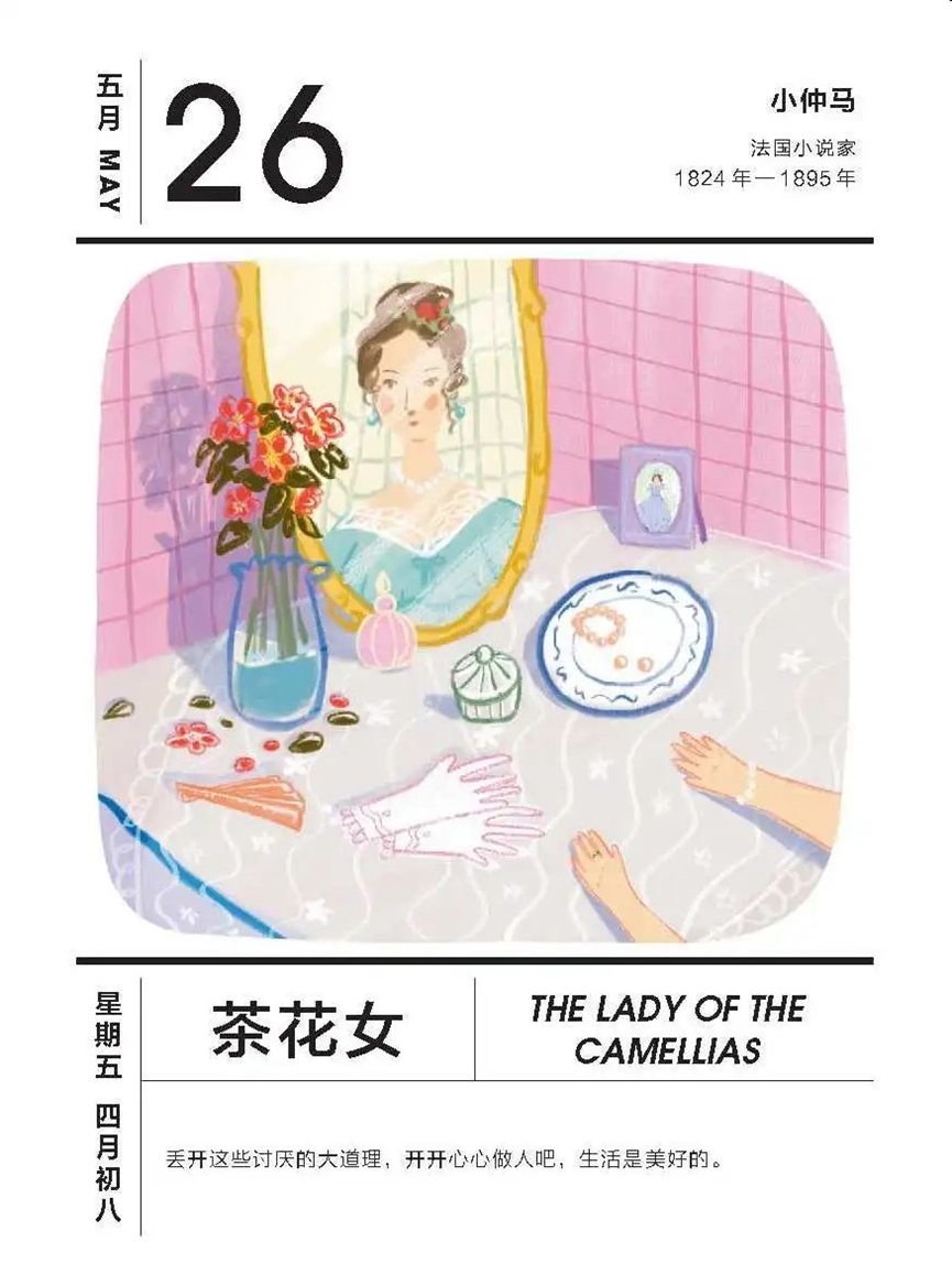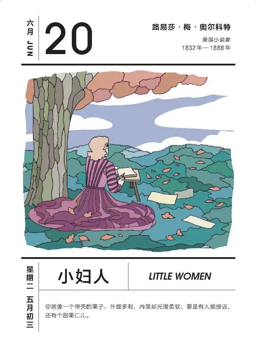 它就是一本妥妥的读书剁手指南,让文学迷一头撞进文学的“黄金时代”。既有巴尔扎克、莫泊桑、奥斯卡·王尔德、简·奥斯汀、叔本华等西方一流文学大师、哲学家,东方的李杜、罗贯中、紫式部、芥川龙之介等“大师的大师”也无一缺席。它打破了文学的次元壁,翻开日历就好像打开了能够穿梭于不同世界的任意门。这些“任意门”的排列顺序则与人类文明的发展顺序大致相似。比如2023年1月1日以国学经典《易经》开始,“阴阳相随”和“万物始生”的哲学思想愿每一位读者“乐天知命,故不忧。安土敦乎仁,故能爱。”被誉为“百年前的青年指南”的《给青年诗人的信》、“自然文学开山鼻祖”《塞耳彭自然史》等“冷经典”,也被收录其中,陪你探索生命中所有光谱。在365页的光阴里,企鹅为我们量身定制了生活金句。用千年的文学经典,把平庸的生活诠释为闪亮的日子。“没有幸福的日常工作,幸福是不可能的”,威廉·莫里斯的《乌有乡消息》让我们瞬间感觉原来自己和这些巨匠一样有着“打工人”的辛酸;儿童节这天的话选自《爱丽丝漫游奇境》:“亲爱的,我们不过是长大的儿童,就寝时间一近就使我们心事重重”,是啊,累了的成年人也想住进满是玩具的帐篷里。不过无论生活中有多少丧丧的时刻,一想到小仲马《茶花女》里“丢开这些讨厌的大道理,开开心心做人吧,生活是美的”,内心就会无比温暖。“你就像一个带壳的栗子,外面多刺,内里却光滑柔软,要是有人能接近,还有个甜果仁儿”,《小妇人》这一页,堪称“表白界的天花板”。“只要你见性志诚,念念回首处,即是灵山”,从小看到大的《西游记》,以前以为是喜剧,如今再看藏着禅机满满的话——取经便是修心。这些极具哲理的精悍名言,都是伟大的作家们凝练一生的生命体验。每天翻过一页,给日常一点诗意或严肃思考的可能性。365个文学高光时刻,让你每一日都能活出不同的主题。它可以是你创作时的灵光,也能是浮躁人心的“安眠药”,陪你在一日日里养成达观的心境。在中国传统的节气、节日,以及重要的国际节假日,日历的插画会被特别设计成藏书票,共有73张。沿着虚线剪开,就可以贴在手帐等任何地方,记录阅读经典的感悟。去年,很多企鹅粉甚至还用它来制作照片墙,成为家里极具艺术感的一角。