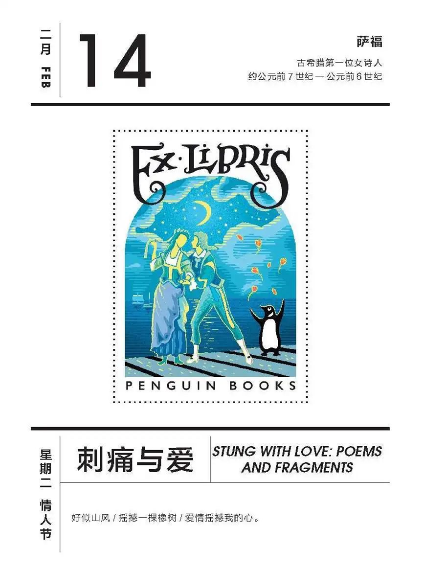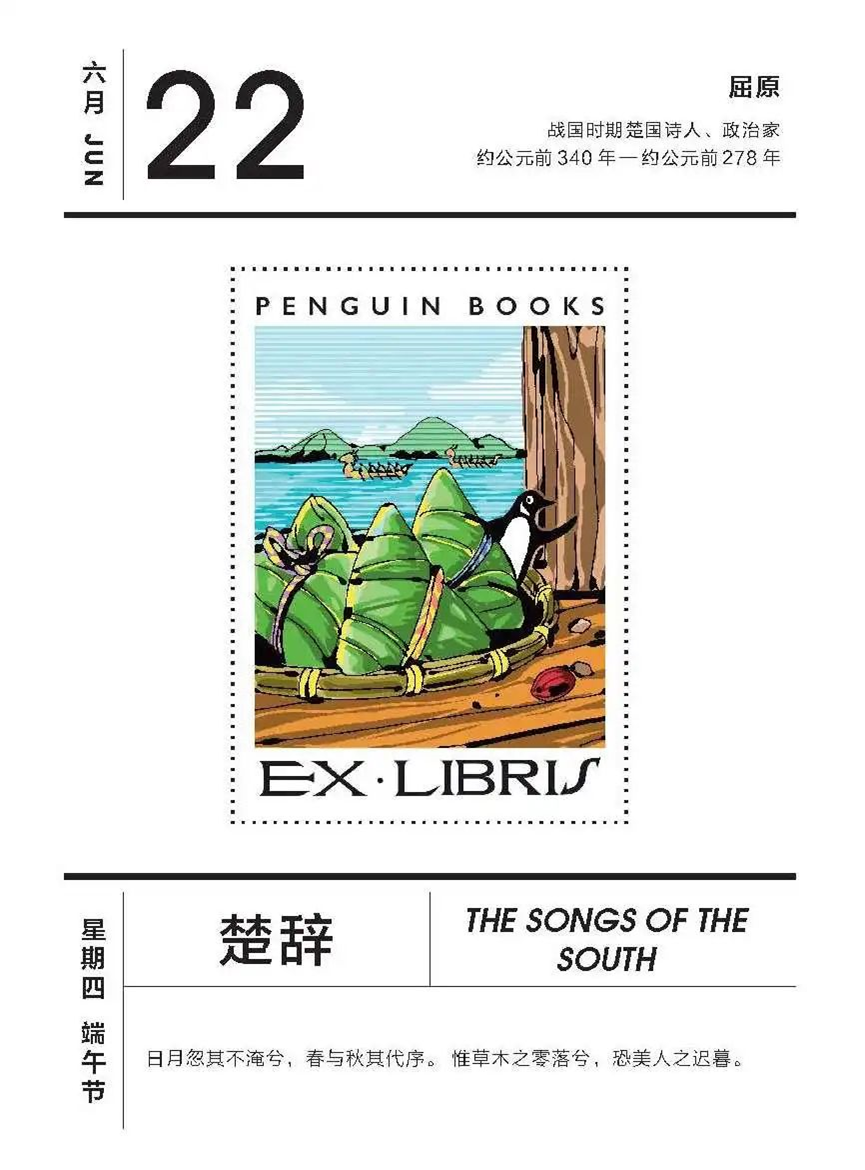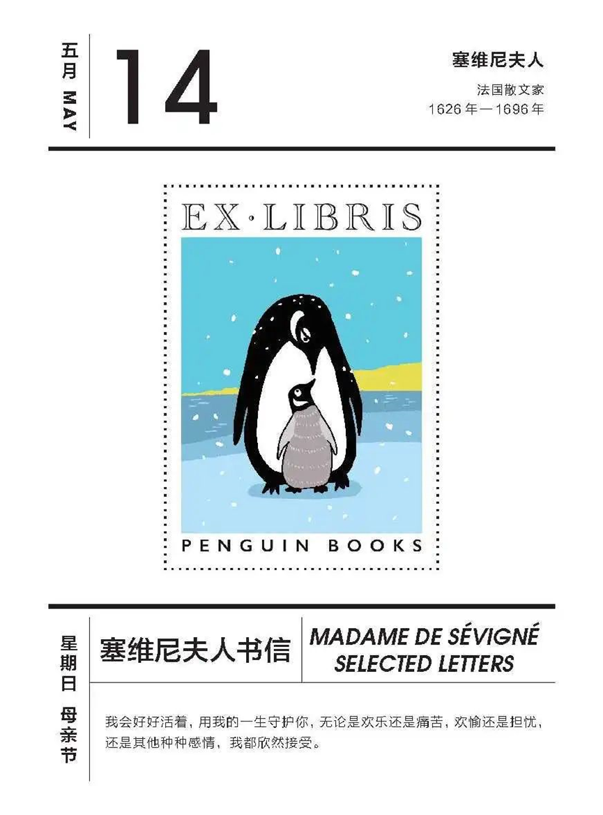 ▲ 藏书票的大小为 50mmX70mm。每张藏书票上都会写明“PENGUIN BOOKS EXLIBRIS”即“企鹅图书藏书”的字样。端午节,当南北方的甜咸党为粽子馅儿争得面红耳赤,但唯一不变的,是中国人仍在用这种软软糯糯的食物来串起家国和味觉,光阴和故乡。“寒衣处处催刀尺”,当年寄居燮州的杜甫,有一天看见家家都在赶裁冬衣,才惊觉:自己已经两年没回家了。添衣问暖,是中国人表达关心的小事,但寒衣节里,丝丝缕缕、针针线线缝好的冬衣,缝进去的都是思念。寒衣节,这个正在被遗忘的中国节,在这本日历里重拾了温暖。中国传统节日的文化韵味,被写在了每一个中国人的日常生活中。西方文学浪漫直接的情感表达,同样也在日历中被记录。2月14日的情人节,选取古希腊女诗人萨福的《刺痛与爱》:“好似山风/摇撼一棵橡树/爱情摇撼我的心。”翻到这一天的日历,那颗被爱慕的心也被轻轻拨动。5月14日的母亲节,选取的则是塞维尼夫人写给女儿的《塞维尼夫人书信》,深情地写道:“我会好好活着,用我的一生守护你,无论是欢乐还是痛苦,欢愉还是担忧,还是其他种种感情,我都欣然接受。”每一张精心设计的藏书票,都在告诉我们每一个要用心对待的特别节日。那些难以言说的爱意,值得被铭记的节日和传统,也都藏在这小小的藏书票里。