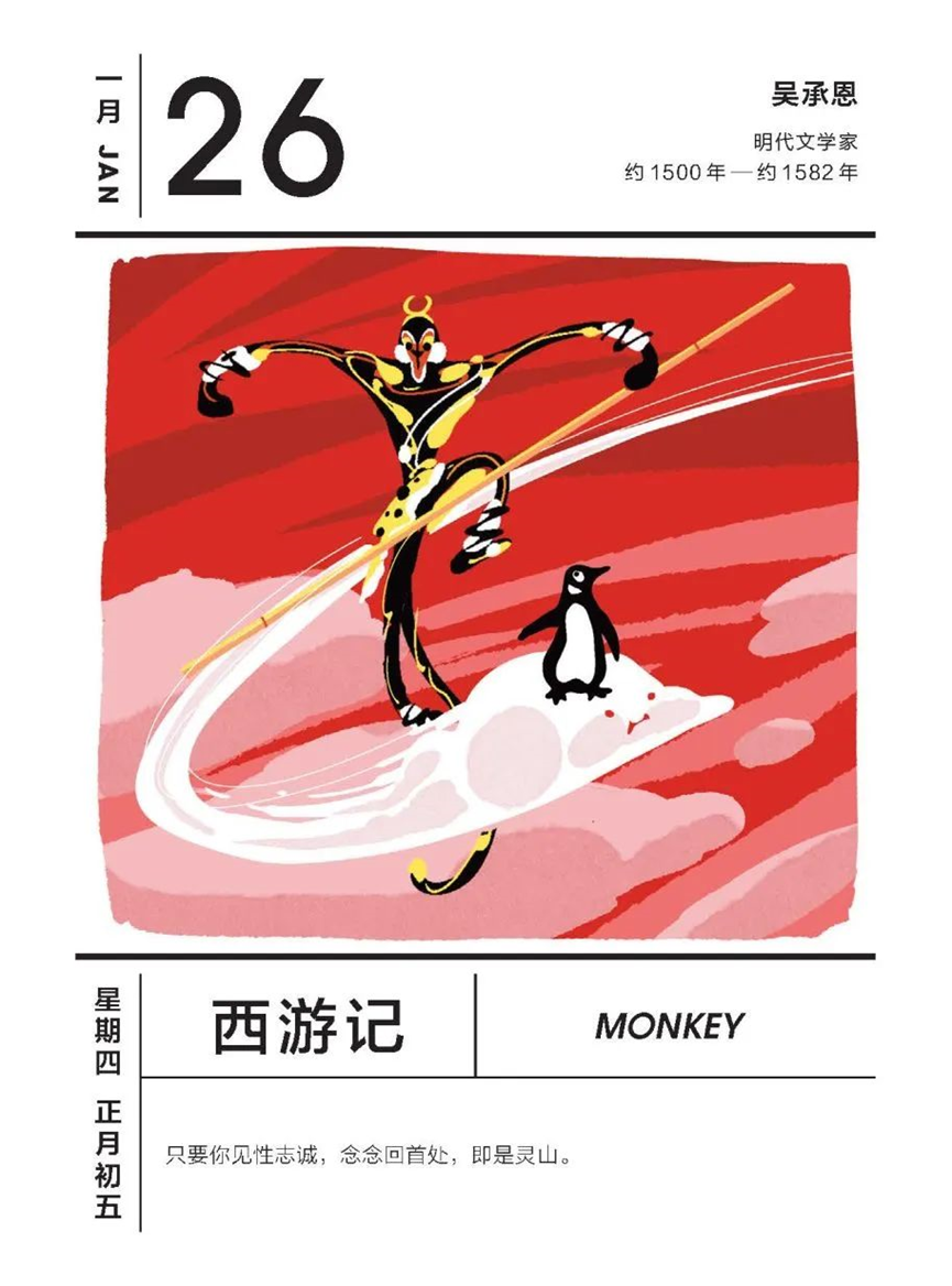 作为企鹅出版社的灵魂,这只87岁的企鹅也在《企鹅日历》中神奇出没。它既是节日节庆的“见证鹅”,也和你喜欢的经典作品来了一场梦幻联动。过春节时,馋嘴的企鹅,拿着一串冰糖葫芦走在下雪的北京,看大红灯笼高高挂;儿童节里,它坠入了《爱丽丝漫游奇境》,变成了可爱的“扑克鹅”,带着充满好奇心的小朋友们一起探索神奇世界;世界哲学日,则化身在《巴黎圣母院》里“学富五车的来自巴黎的思想家鹅”。在英国探险家詹姆斯·库克的《库克船长日记》中,它则变身为“船长鹅”乘风破浪前行;它是《堂吉诃德》里陪堂吉诃德持长矛大战风车的“理想主义鹅”,也是《叔本华思想随笔》里靠着暖炉的“思想鹅”……企鹅的不定期出没,让那些厚重的人文经典都变得亲切可喜,也让未来即将翻开的日子,无比值得期待。