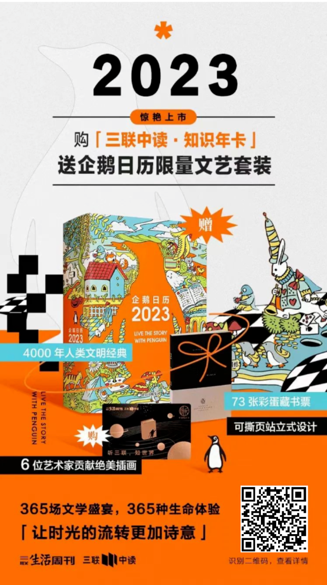 美国文学评论家哈罗德·布鲁姆曾说:“我们都害怕孤独、发疯、死亡,莎士比亚和惠特曼也无法让我们不怕,但他们带来了光和火。”文学带来的光和火,是安慰,是同情和理解,是不确定世界里的稳定感。但在20世纪初期的欧洲,文豪巨匠们当年的文学著作,是只有精英阶层才能读到的“奢侈品。”直到1935年,企鹅出版社的创始人艾伦·莱恩爵士在火车站候车时,萌生了以平装本形式再版优秀文学作品的念头——每本书定价6便士,只要一包香烟的价格。英国作家毛姆兴许不会料到,《月亮与六便士》出版十六年后,“六便士”这一世俗的象征,会变成每一个英国人都消费得起的文学,变成了文学迷们抵达月亮的硬币。如今,企鹅在出版界的地位,就像“奥斯卡金像奖”之于电影。全球迄今共 121位诺贝尔文学奖得主,70位都选择在企鹅出版社出书。它不仅是一本日历,更是一部“六便士的梦的合集”。它从企鹅经典系列1200多本书中精选了339部世界级必读经典,为你挖掘出365句文学语录。当我们被其中的话语触动心境时,便获得文学如月光般的抚慰。每翻过一页,我们也收集起一枚抵达理想的硬币。在岁月轮转间,将我们送抵文学的理想之境。感恩周特别献礼,本周内(11.27—12.4)开通/续费三联中读知识会员,不仅能享受298元的特惠价,更能免费获得价值176元的企鹅日历限量文艺套装,内含:《企鹅日历2023》+企鹅经典·小黑书手账本!365场文学盛宴,365种生命体验,拥有它,让时间的流转更具诗意。《企鹅日历2023》精选的作品覆盖文学、历史和哲学,汇集4000多年来人类文明史上的必读经典之作。