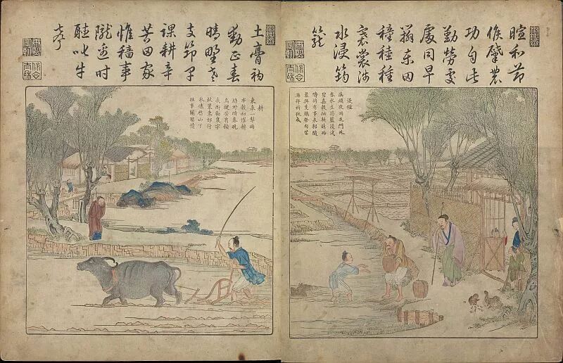 《耕织图》,中国古代为劝课农桑,采用绘图的形式详实记录耕作与蚕织的系列图谱。原为南宋绍兴年间画家楼璹所作,此为清代彩绘本(来源:书格)