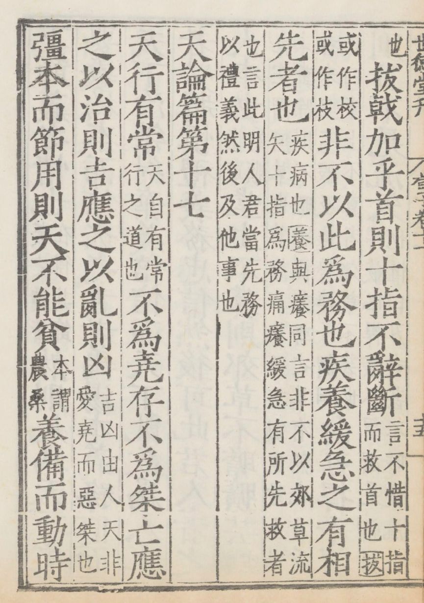 《荀子·天论》中提出“天行有常,不为尧存,不为桀亡”,揭示出自然界运动变化有其客观规律。此为唐代杨倞注,明嘉靖时期顾氏世德堂刊本(来源:书格)