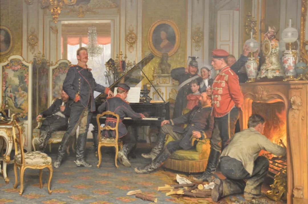 安东·冯·维尔纳画作《巴黎郊外的旅所》(Im Etappenquartier vor Paris)描绘了普法战争期间普鲁士军队占领布鲁诺伊堡的场景,也体现着德国战中与战后的公众舆论态度(图片来源:wikimedia.com)