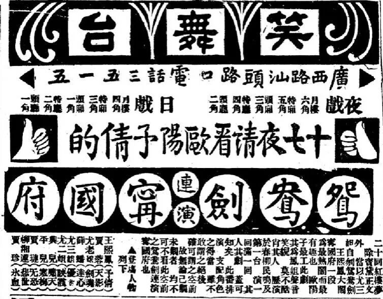 更能说明欧阳予倩艺术地位与影响的,是当时报纸上的演出广告。晚清时大众媒体发展迅速,报纸上刊载大量演出广告。在一份广告中我们可以看到,欧阳予倩和另一位有一定名气的京剧演员赵君玉用同样大的字体并排而列,而且他们的剧目《天河配》安排在最后一出,意思就是他们在这个戏班里挂“双头牌”,二人的地位不分先后,共同挑班。再看票价,这场演出的花楼、月楼都要卖到一块钱,戏价仅次于北京请来的一流明星演员,上海在地的演员里,超过这个戏价的演出屈指可数。考虑到从北京聘请一流明星演员的演出并不常有,所以就日常演出的票价论,欧阳予倩和赵君玉演出的最高票价基本上就代表了这个市场上的最高水平,这是除京剧外其他剧种的表演(包括电影首轮放映)很少能达到的高价,亦可以从中看到欧阳予倩在新舞台搭班演出时的地位。如欧阳予倩自己所说,他离开南通伶工学社后,跟余叔岩“混”了一个月。所谓“混”的意思大抵是指上海的戏园子特地从北京聘请余叔岩来上海演出,欧阳予倩和其他的在地演员为余“垫场子”。我们可以在一九二三年一月十七日、二十日《申报》第三版的广告上看到他在有余叔岩担纲主演时位置的变化:有余叔岩在,欧阳就唱不上大轴了,但是他的戏仍然被安排在倒第二的位置。他分别演出《人面桃花》和《宝蟾送酒》,李春来、朱琴心也参加演出,这些都是行内很不错的演员,而演出都排在欧阳予倩的前面。这就是说,欧阳予倩的地位当然比不上余叔岩,当戏院里有余叔岩这样的名伶挂头牌时,他就只能挂二牌。余叔岩其时是和杨小楼、梅兰芳同列 “三大贤”的国剧宗师,梅、余一起演出时,一定是挂双头牌。从这些广告里透露出的信息是,欧阳予倩在京剧行里尽管达不到杨、余、梅那样的高度,但是只要没有这样的巨星,他就一定在领班的大轴位置。一个没有经历科班的训练、非专业出身且没有拜过师的京剧演员,能够有这样的艺术地位,是非常了不起的。![]()