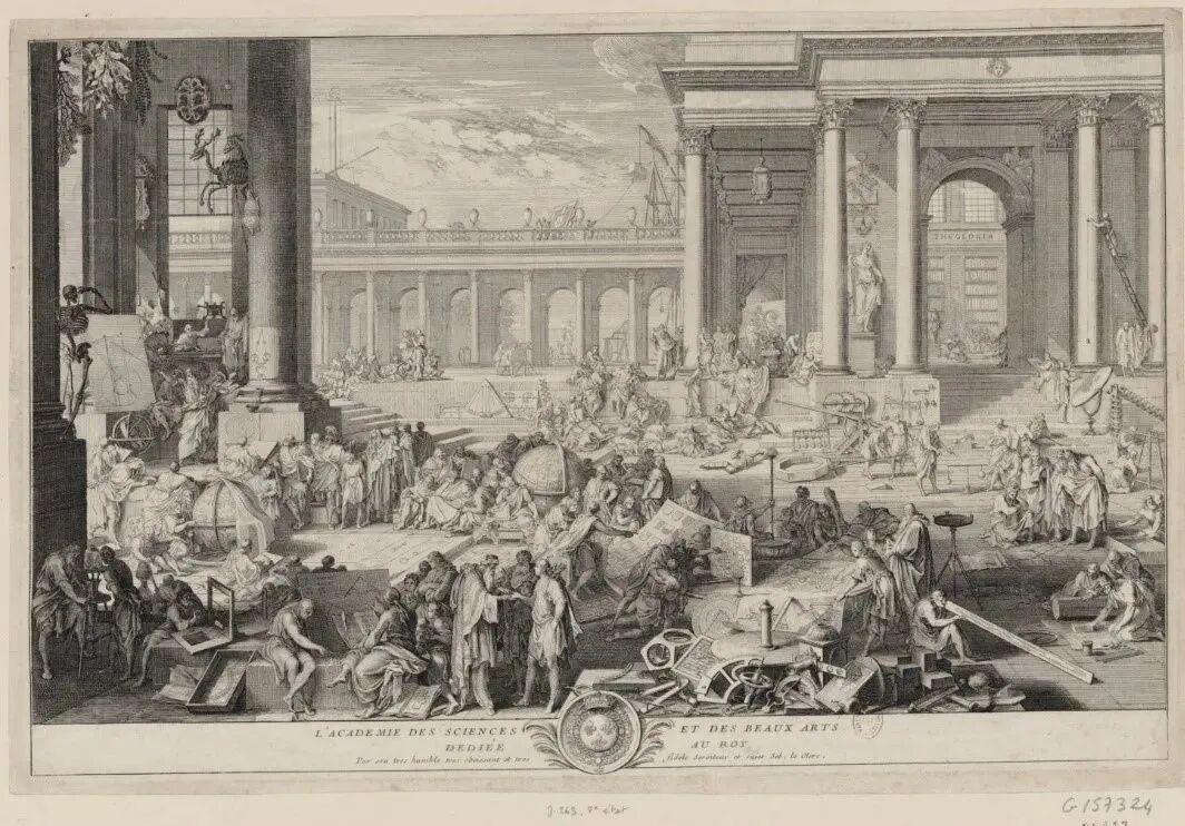 这个故事可以先从亚洲讲起。一六八九年,在中俄两国的谈判桌上,双方各自拿出了一幅地图。清廷钦差手持《吉林九河图》,而俄国人则使用《鞑靼北部与东部图》(1687,BNF, Cartes et plans, CPL GE DD-2987-7372B),后者是另一位荷兰制图师尼古拉斯·魏特森(Nicolaas Witsen)的作品。同德·威特的一样,地图采用当时欧洲流行的赤道平面投影,标有经纬度,相对准确地反映了彼时东北亚地区的空间轮廓与地理知识。中方的地图同样试图描绘这片区域,但使用的是传统舆图的制作技艺,既没有投影法,也不画经纬线。因而,尽管两幅地图上都标识了重要地点,山脉河流的方位也大致吻合,但制图术的差别造成了领土表象上迥然不同。对此,在场协助谈判的两位耶稣会士都在日记当中有所记载。郎谈《吉林九河图》,台北故宫博物院藏 1687年Nicolaas Witsen的地图巴黎法国国家图书馆藏 在耶稣会士看来,来自北京的官员尽管手持地图,却对图像与疆域之间的实际对应缺乏认知。故而,“诺兹山脉”(今外兴安岭)一带看似只有“毫厘”,在俄国人的大地图上却差之“千里”,引发的争议一度导致谈判陷入了僵局。徐日升将此解读为清廷官员地理知识的不足和外交经验的匮乏,而同行的张诚却将注意力放到两幅图的技术差异上,并且打算另绘制一幅新地图作为礼物献给康熙皇帝。事实上,从尼布楚回京后不出数月,张诚便呈送了这幅新的亚洲地图。此图依照西式制图法,标有地理数据,但并不完整,因为图上的中国北方地区标绘粗陋,存在大片空白与模糊地带。以地图作礼,并非法国人首创。十七世纪初,利玛窦在面见明朝的万历皇帝时,也进献过一幅《坤舆万国全图》。为讨欢心,利氏还稍作改动,将180°经线放于此图中部,中华帝国由此也就处于世界的中央。相较于前辈这件赫赫有名的献礼,一六九〇年张诚的地图后人鲜有问津,对当时地理空间的绘制也算不上完整。但当康熙手持此图,御览疆土时,国土空间的已知与未知跃然纸上。其时正值内忧外患,常听耶稣会士讲学、青睐西洋科技的皇帝对法国人的制图技法刮目相看。适逢京城附近的白河决堤,需要舆图配合治理,一七○五年,他决定让法国耶稣会士来测绘一幅地图,这正中张诚等人的下怀。一六八五年三月,张诚、刘应(Claude de Visdelou)、李明(Louis-Daniel Lecomte)、白晋(Joachim Bouvet)、洪若翰(Jean de Fontaney)等人在法国布雷斯特港登船启程时,王室是委托了制图任务的。他们被授予“国王数学家”(Mathématiciens du roi)的称号,个个精通数理几何,擅于测绘。临行前,国务大臣还专门会见了他们,由巴黎天文台台长卡西尼(Jean-Dominique Cassini)亲自制订了用于测量经纬度的表格,还配备了最新的科学仪器。可以看出,路易十四派遣这个使团并非纯粹为了传教事业,同行的居伊·塔夏尔(Guy Tachard)就说:“国王成立了皇家科学院,致力于发展科学与艺术,所以特地派遣我们前往海外观测,进而修正地图,发展航海和天文事业。”所以,搜集亚洲内陆数据,绘制中国新地图,是耶稣会的另一项重要使命。但此事到这里也只说了一半,还有另一半的故事发生在欧洲。1698年Sébastien Leclerc的版画《皇家科学与美术学院》巴黎法国国家图书馆藏