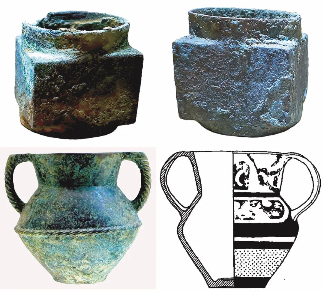 曲村晋侯贵族墓葬M113出土的青铜仿制龙山玉琮、双耳罐,对比右下的陶寺龙山双耳罐