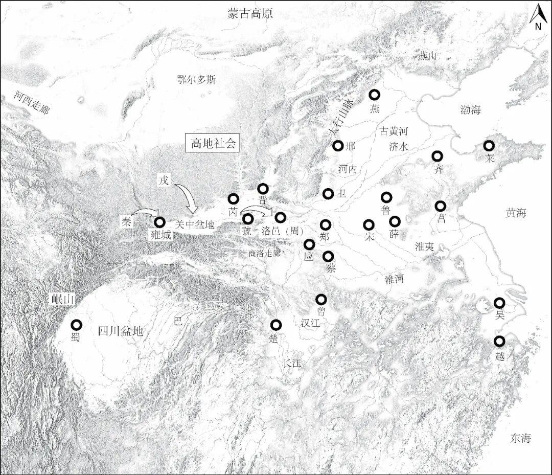 为有效控制高地社会,王朝在晚商时代人烟稀少的晋南建立唐(晋)国,并将鬼方“怀姓九宗”迁入盆地。在《左传》(定公四年)中传承的封唐诏令中,“命以唐诰,而封于夏虛,启以夏政,疆以戎索”所涉及的“夏”“戎”交叠正是高地龙山传统分野的结果。在黄土高原之上,周王朝在殷商势力从未到达的泾河和渭河上游设立了一系列深入寺洼文化分布区的据点。甘谷朱圉山附近的毛家坪和李崖两处西周遗址出现周人、殷商遗民、高地部族陶器传统与葬俗共存的现象。清华简《系年》追述的秦人祖先传说中,参与武庚叛乱的商奄贵族被流放至此,为周人防御戎人部落。在秦穆公称霸西戎之前,秦国始终是戎人包围之中的一块飞地。在中原东北方向,琉璃河西周早期燕国都邑同时出现殷墟四期风格袋足鬲、西周联裆鬲以及沿袭高地龙山制陶传统的围坊三期高领袋足鬲。其中殷商与西周两种陶器传统都是在西周早期随着燕国的建立由商、周移民人口带到当地的。秦、燕两地跨度将近一千六百公里,揭示出王朝重组政治版图的雄心。西周的灭亡显示周王朝始终没有成功地将高地社会纳入其政治秩序——戎族入侵关中,贵族世代传承的青铜器被掩埋,曾经在周原紧密的社会网络和由铭文礼器所承载的社会记忆因为失去其物化载体变得如同历史传说。关中的失陷与东周政治中心东移使得王庭与位于四川盆地和黄土高原的社会逐渐疏远,形成中原政权与高地群体之间的第四次文化分野。此后,四川盆地远离东周列国,到战国晚期才为秦国征服——古史传说中的岷山故事,可能来自关中陷落之前。![]()