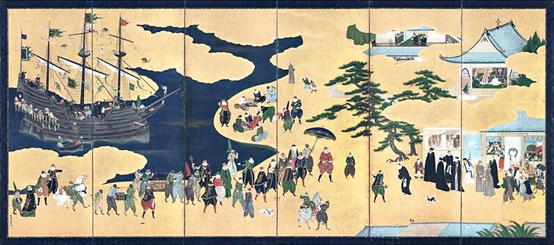 日本绘师狩野内膳的《南蛮人渡来图》(南蛮屏风),描述葡萄牙商船在16、17世纪抵达日本港口贸易的盛况,日本人称之为“南蛮贸易”(图片来源:chiculture.org.hk)
