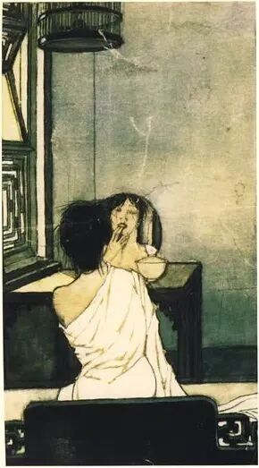 闻一多为潘光旦著《冯小青》所绘制的水彩插图《对镜》,1927年。画面上部的鸟笼、冷寂的用色,象征了冯小青悲惨的命运(来源:eyjx.com)