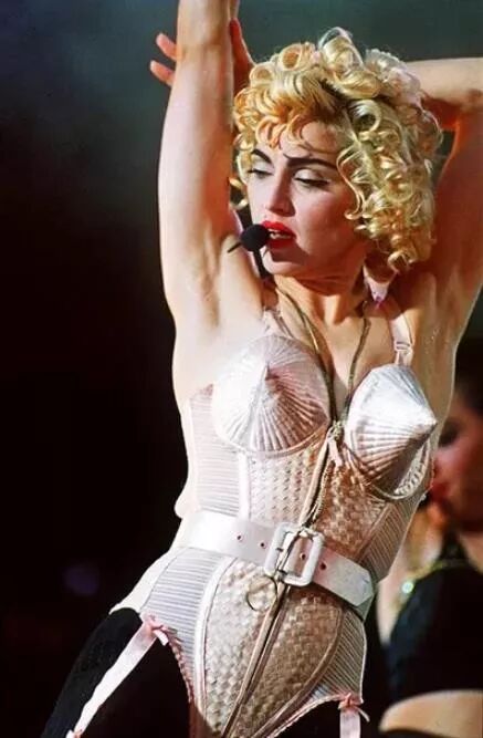 比如:她在1990年的巡演当中,穿着这件锥形胸罩登台,震惊全场,甚至惹怒了教皇。这个叛逆大胆的造型至今依旧是她事业的传奇标志。