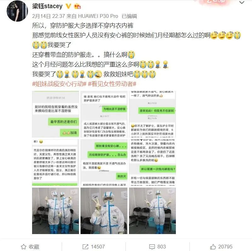 梁钰身为女性,自然对女医护人员更能感同身受。于是她在微博询问,一线医护人员如何解决月经期问题?她们的卫生巾和安心裤(裤型卫生巾)还够吗?