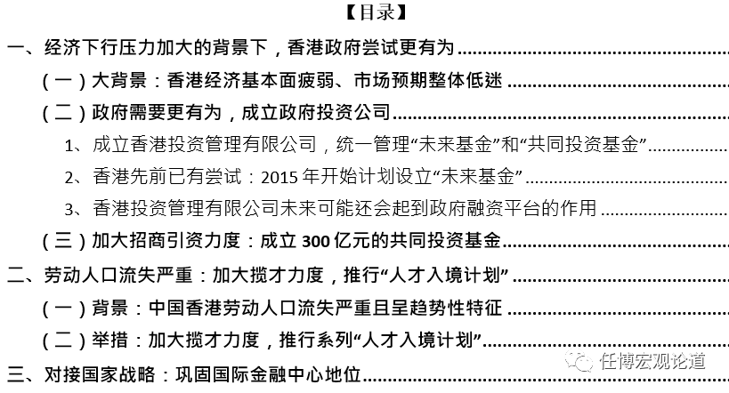 为应对上述困境,香港政府认识到其需要更有为,以弥补市场力量的不足。报告指出已指示财政司司长成立全新的香港投资管理有限公司,把在“未来基金”(下设香港增长组合基金、大湾区投资基金、策略性创科基金)和共同投资基金(从未来基金拨出300亿元设立)统一起来,由政府主导投资策略产业,吸引和助力更多企业在港发展。