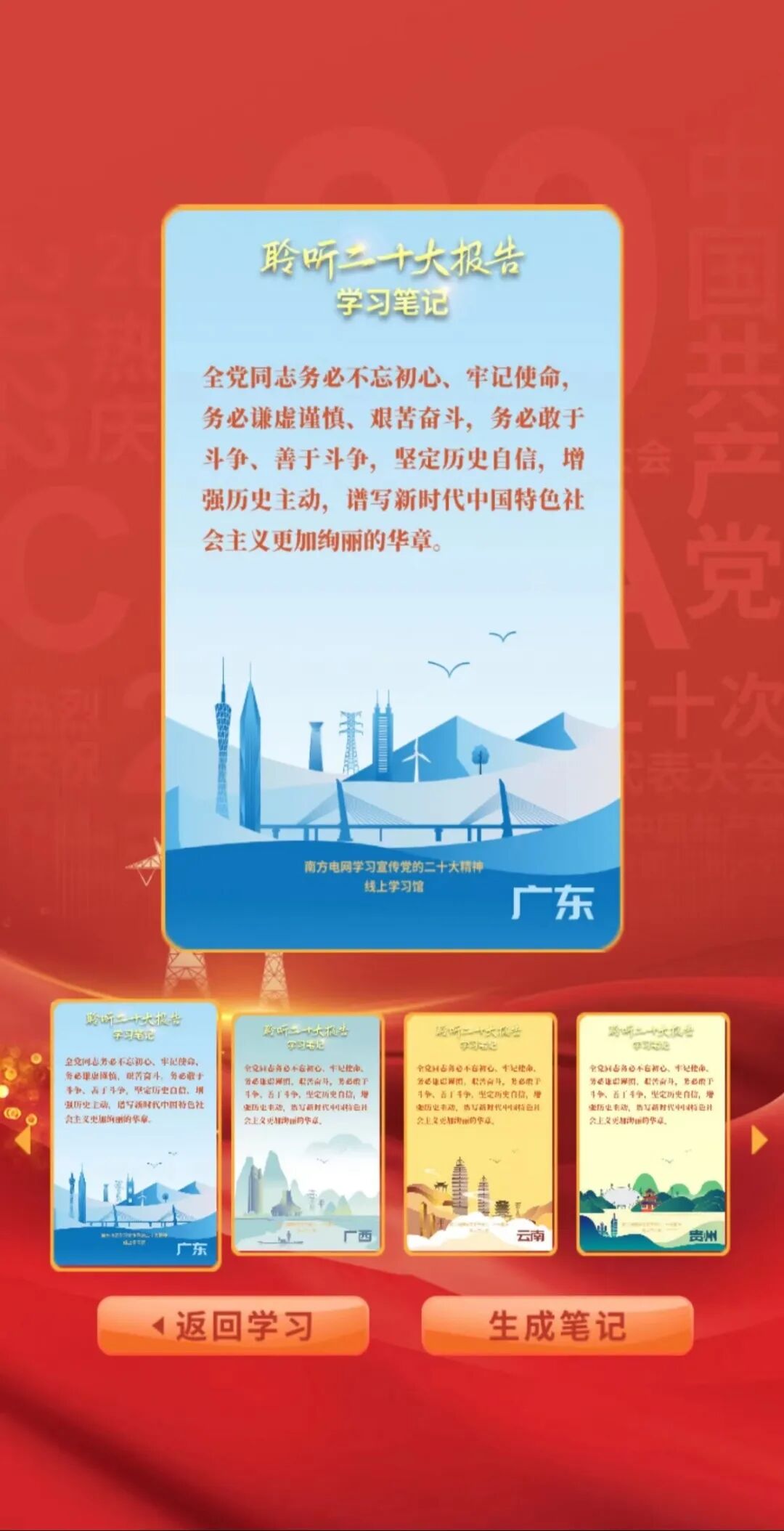 南方电网公司充分运用新技术新应用,策划建设线下展览、线上学习馆、理论宣传服务号三个平台阵地;依托平台组织开展学习党的二十大报告的“我的学习笔记”“我是朗读者”“答题挑战赛”三项互动体验活动,形成线上线下“3+3”全场景融合互动矩阵。该宣传矩阵旨在通过强化互动化传播、沉浸式体验,让干部职工听得懂、能领会、可落实,推动公司学习宣传贯彻党的二十大精神往深里走、往心里走、往实里走。